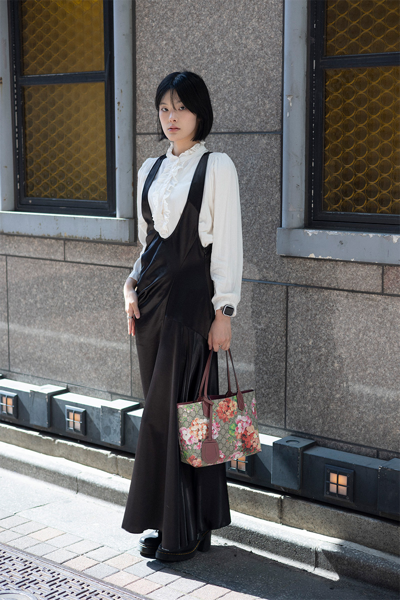 モノトーンでまとめた全身に、春らしい花柄のバッグを合わせました。