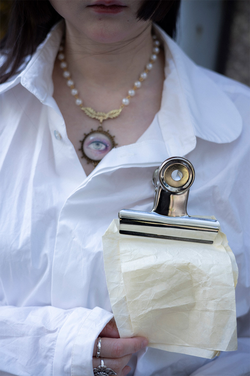 目玉モチーフのアクセサリーと、病院をイメージしたガーゼのディテールで、狂気を表現しました。