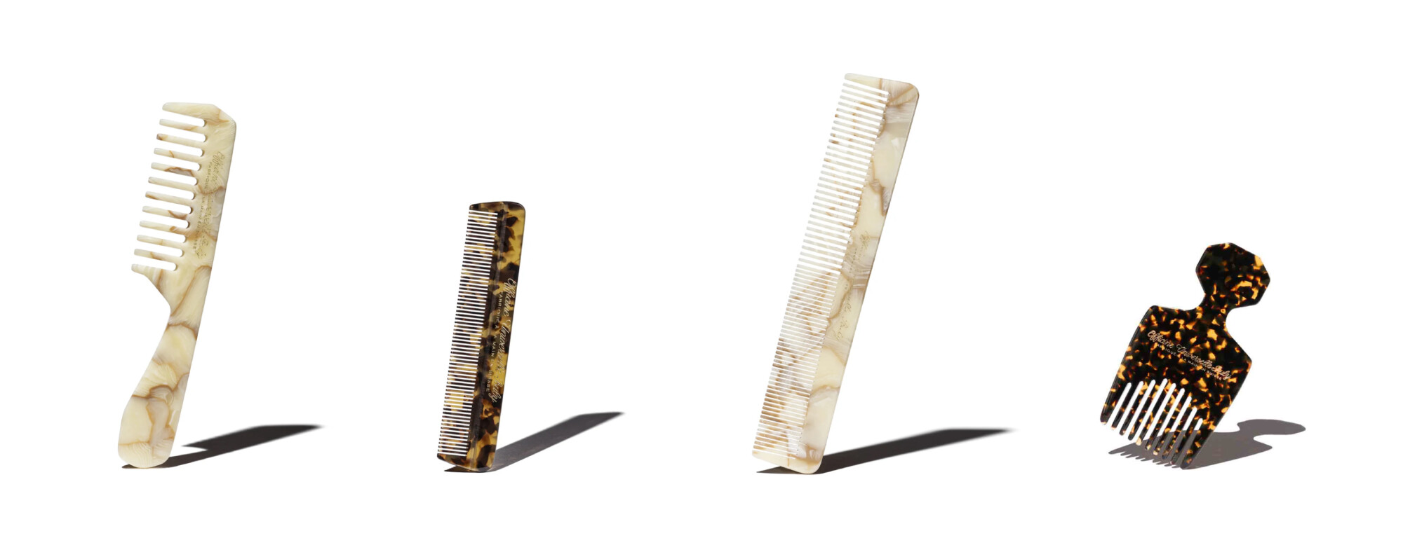 ビュリーのコームに使われるアセテートは、環境にやさしい植物由来の繊維を原料とした、静電気が起きにくく、高級感のある素材。頭皮をいたわる形にコームの歯をカットし、ポリッシュでコーティングするまで、現存するスイス最古の工房をはじめとする、職人の手作業で作られている贅沢なアイテム。