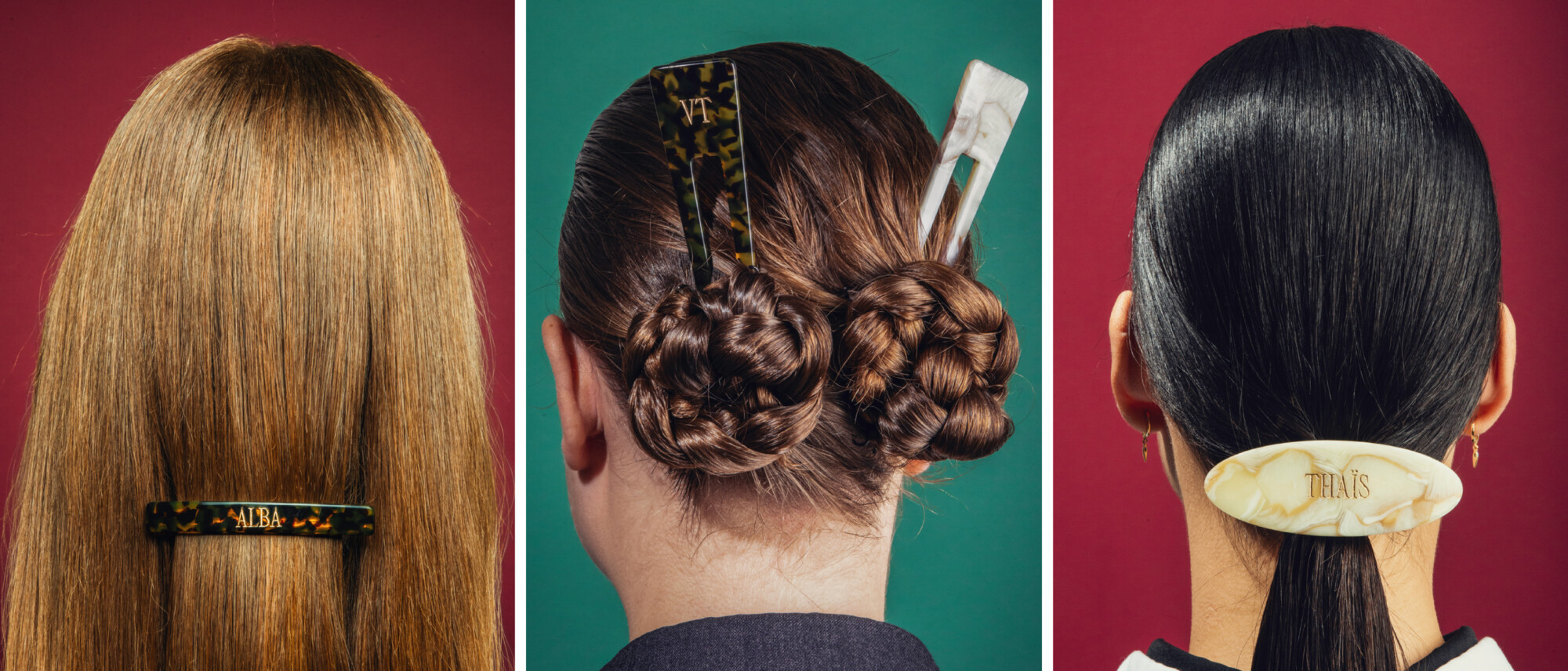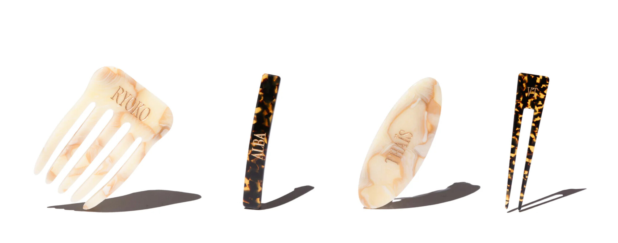 上品なシニヨンコーム、バレッタ、かんざしといったアセテート製のヘアアクセサリーは「濃緑」と「アイボリー」の2色展開。これらのアクセサリーやコーム、ブラシには、名前やイニシャルを刻印できるので、プレゼントにもぴったり。