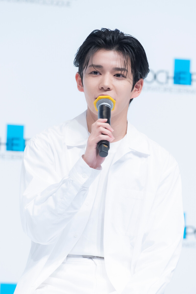 ピュアホワイトのセットアップに身を包んで登壇した長尾さん。アンバサダー選出の背景には、アイドルや俳優としてステージで見せる生命力溢れる姿の裏にある、日々の環境の変化による肌荒れなどと向き合う等身大の姿への共鳴があったと、日本ロレアル株式会社 ダーマトロジカル ビューティー事業本部長の岩切 直子さん。