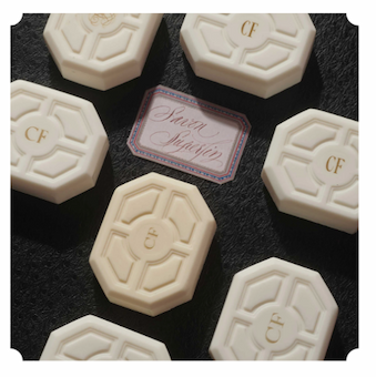 中性せっけん「サヴォン・スゥペールファン」にはアルファベット3文字まで刻印が可能。ビュリーのオリジナル書体、または17世紀の印刷専門家シャルル・マヴロー考案のモノグラムから選べる。モノグラムは288種類のラインが絡み合い、螺旋状のデザインを描き出す。アカデミックなデザインが好みならオリジナル書体、アーティスティックなデザインが好みならモノグラムがおすすめ。