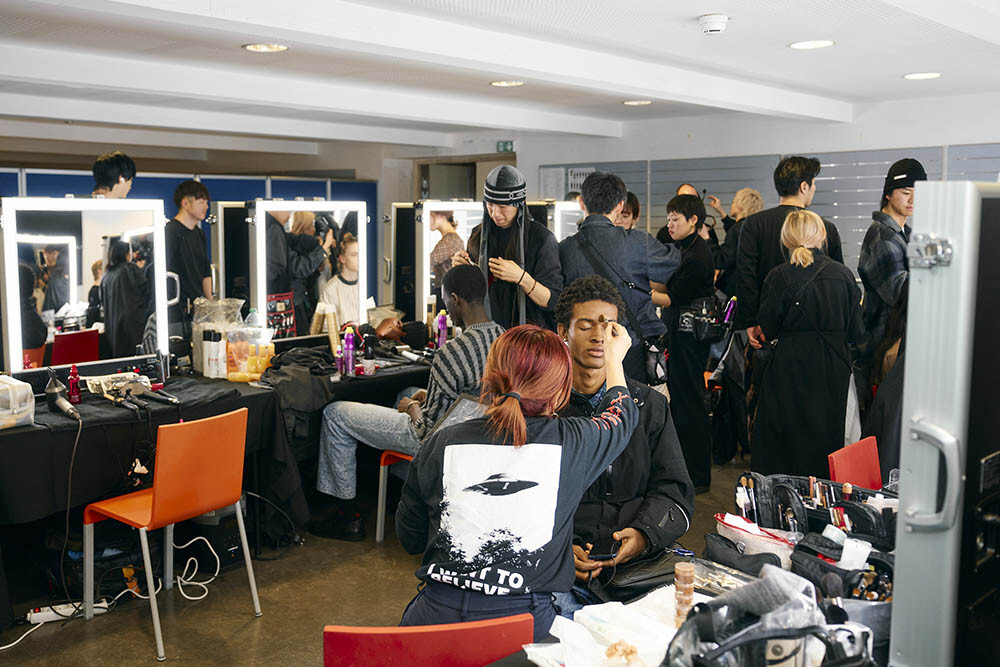 ショーの4時間前に会場入りしたヘアメイクチーム。部屋の中は穏やかな雰囲気で、皆が着々と仕事をこなす。