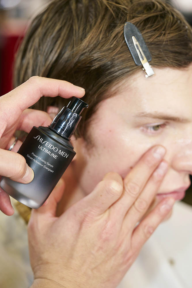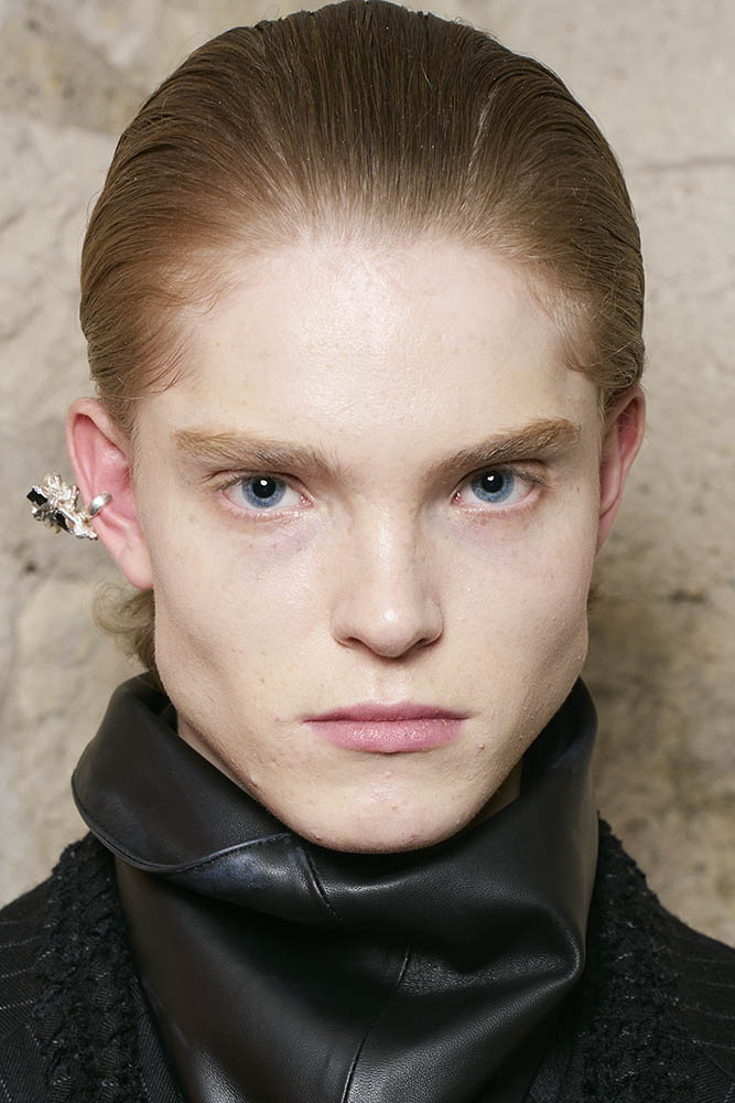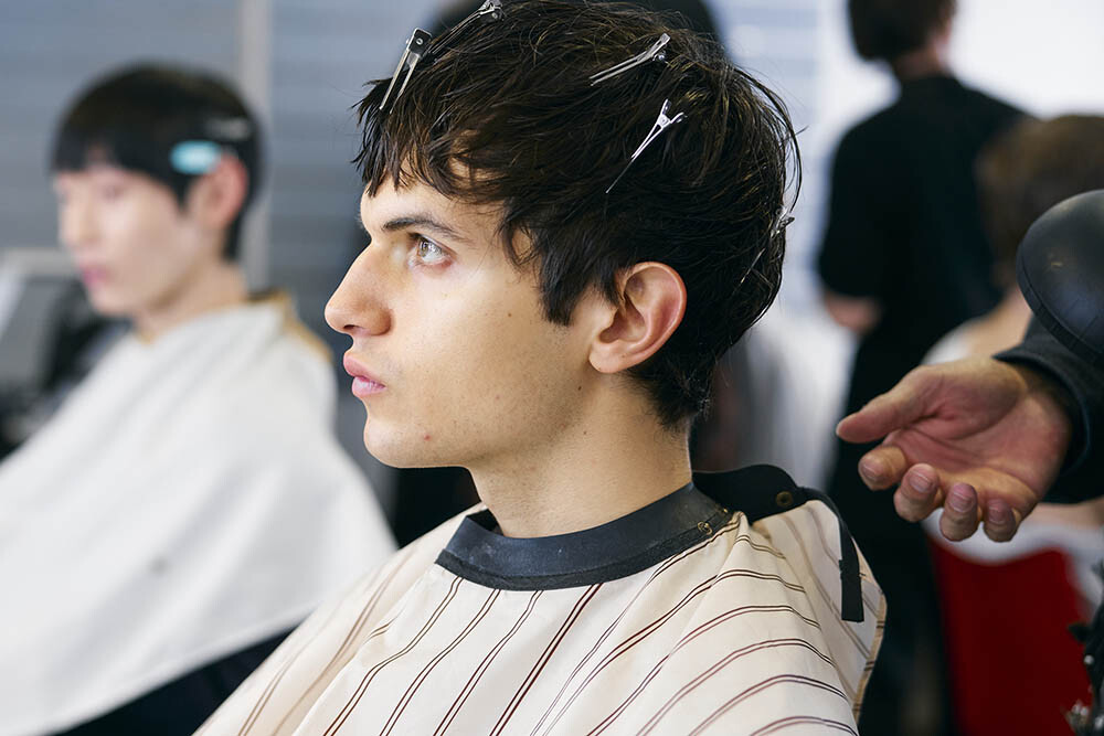 「モデルたちが本来持っているものを“変える”のではなく“引き出す”というヘアメイクのプランを組み立てました。例えばショートヘアの彼は、髪に自然な揺らぎがあります。そのニュアンスを消さずに、いかに表面をクリーンに仕上げるか、ということです。スタイリング剤はかなりライトなものだけに絞り、髪質を人工的に見せないように整えています。素材を“ナチュラル”の中で、最高のレベルにもっていく。それを狙っています」