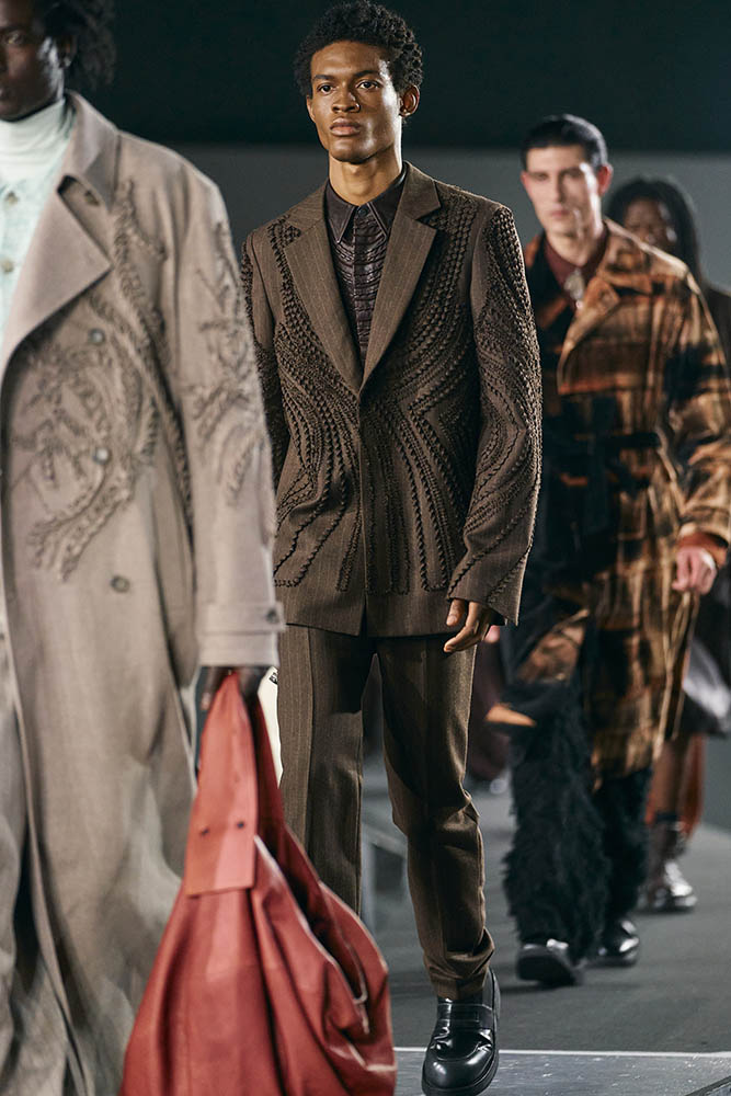 コレクションに盛り込まれた縄文土器のような刺繍がすばらしい。