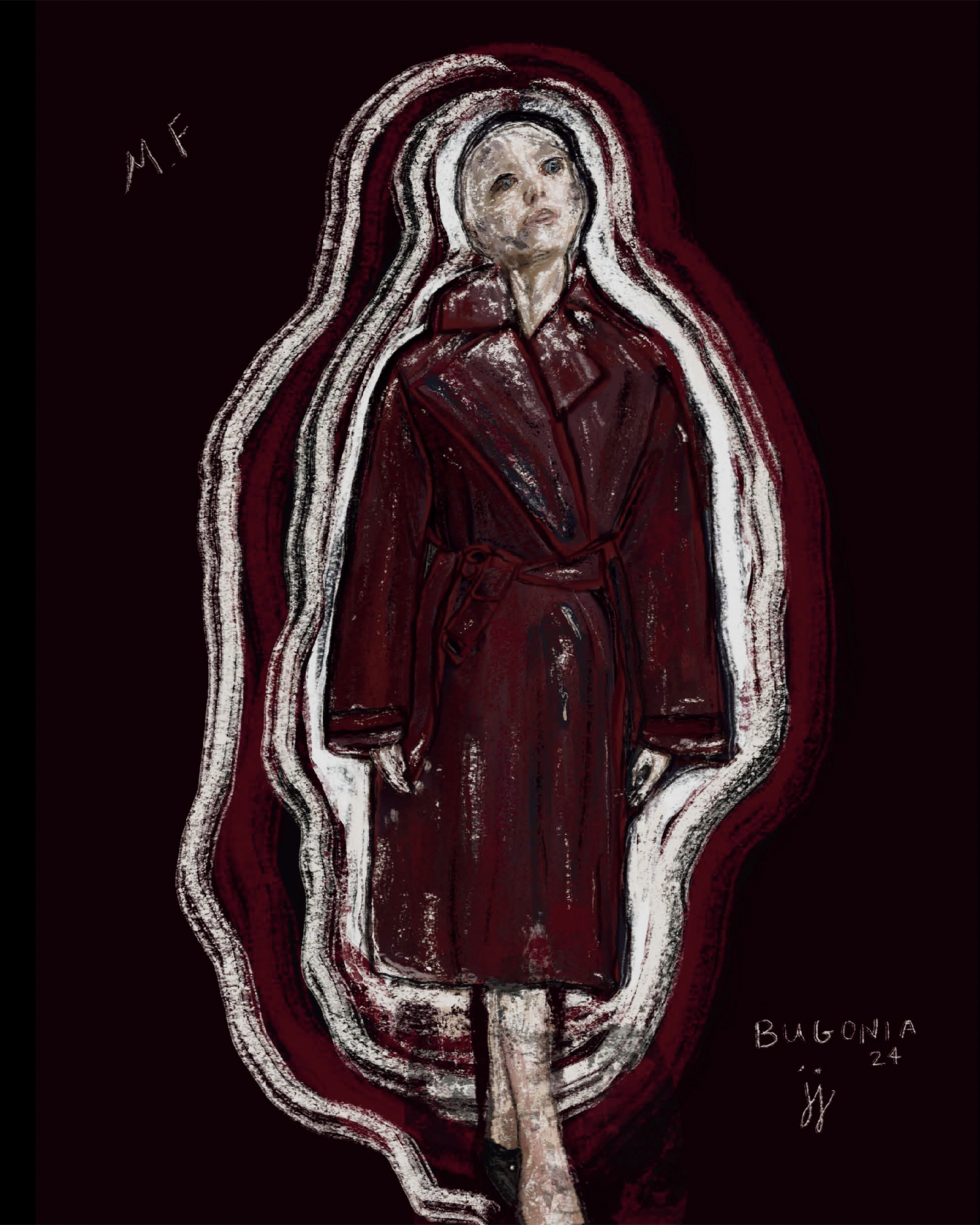 大手製薬会社のCEOであるミシェル・フラーの仕事時の衣装は、仕立てのいい黒のジャケットとスカートのセットアップ、白シャツ、栗色のコート、サンローランのバッグに、クリスチャン ルブタンのハイヒール。「彼女には自分の個性やスタイルなどはなく、アシスタントにCEOらしい服装のためのリスト作りをさせていると想定していました」と、衣装担当のジェニファー。マックイーンのブレザージャケット以外はすべて制作されたもので、特に、劇中で多くの時間ミシェルが着ることになる栗色のトレンチ風のコート(上)は、同じデザインを10着ほど用意したという。衿や肩回りの構築的な造形が上半身のカットでもキャラクターを印象づけるデザイン。