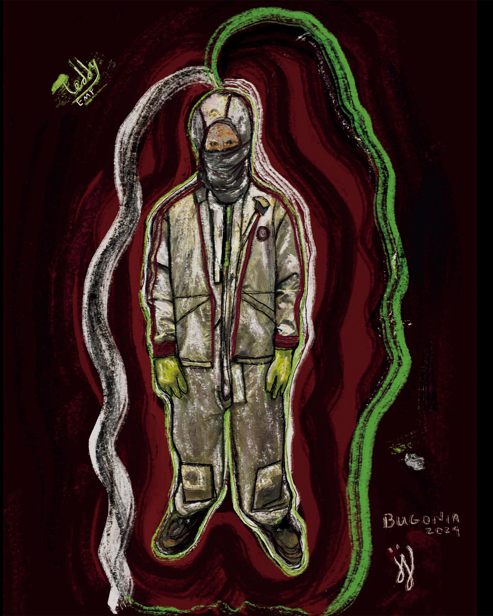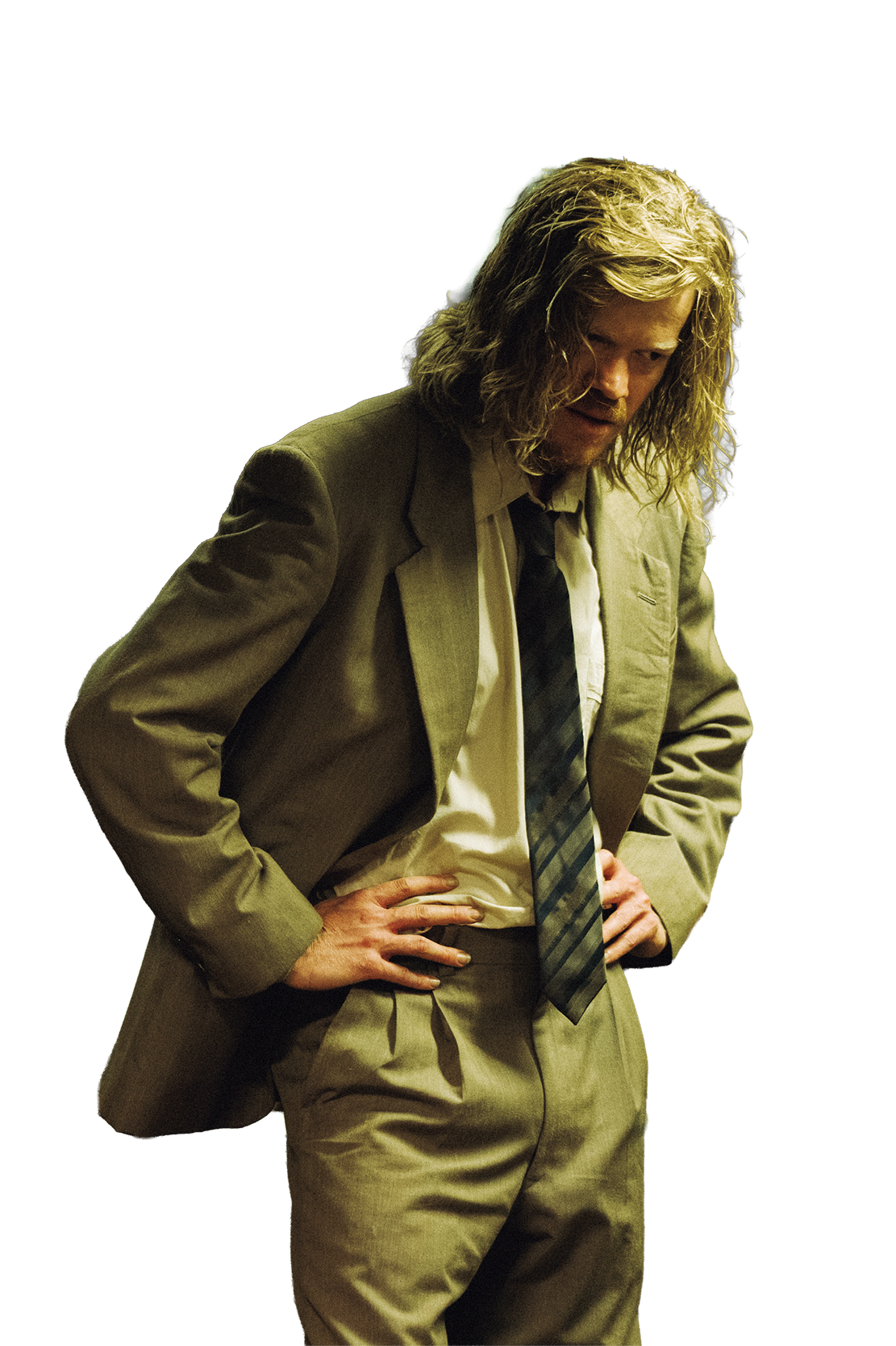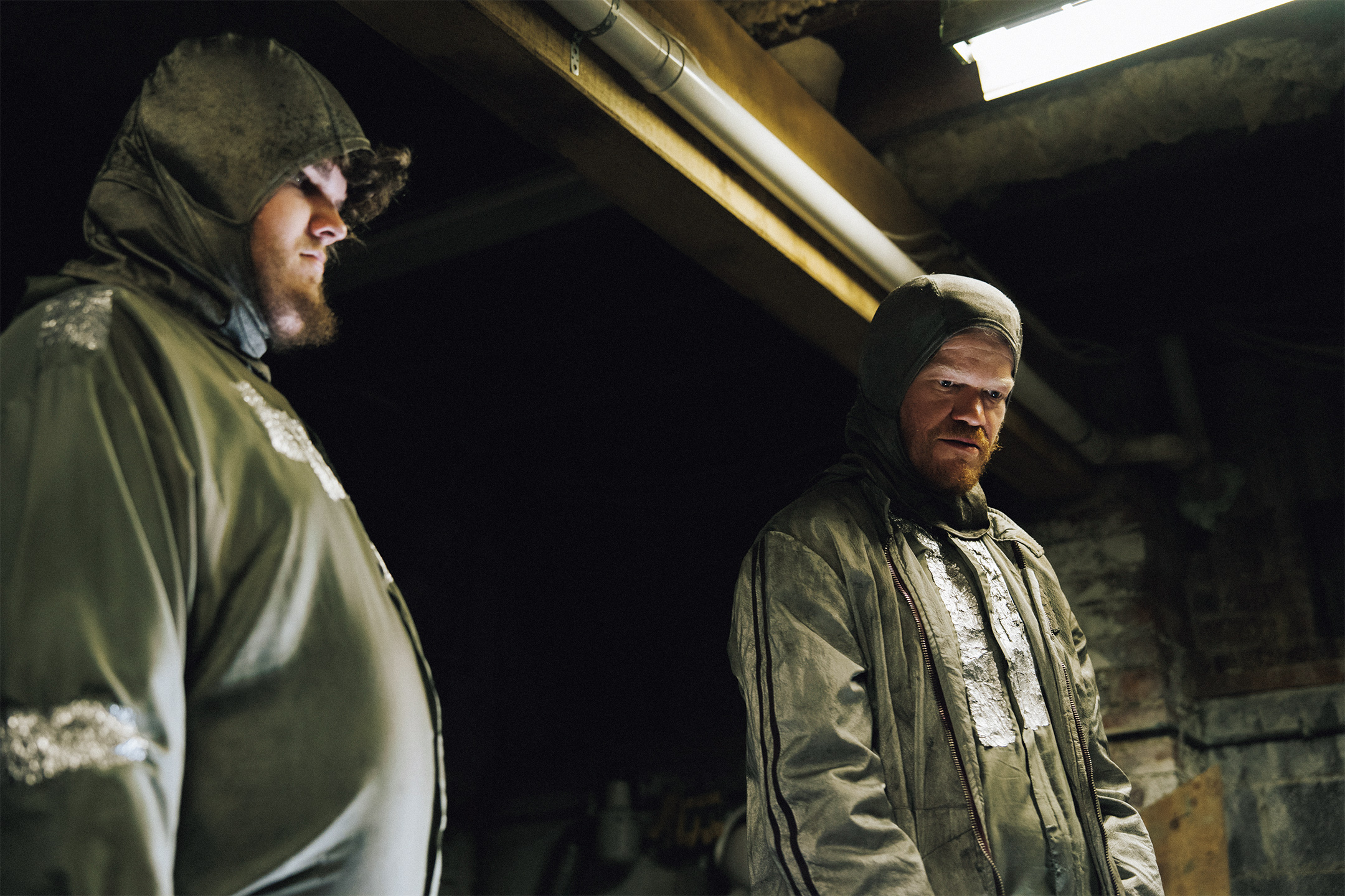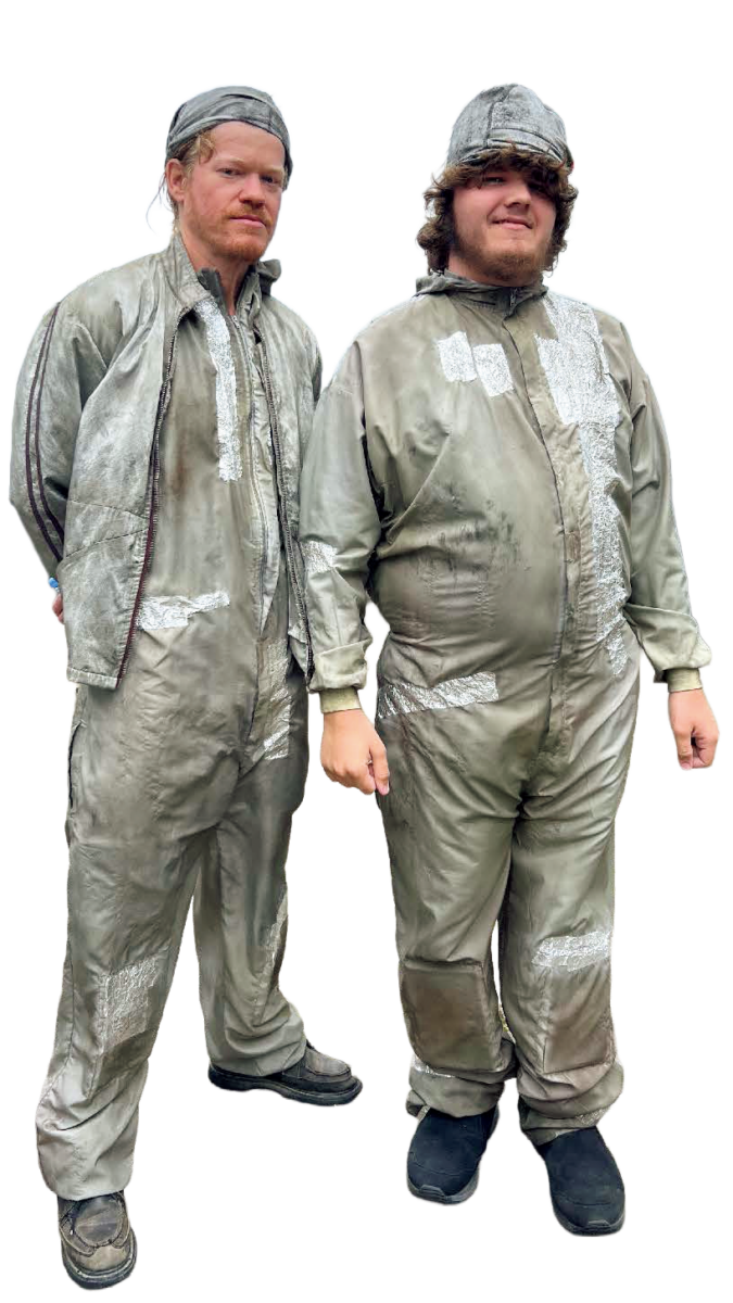 宇宙人の地球侵略というパラノイア性質を持つテディ(左)と、そんなテディが自分の世界のすべてであるいとこのドン(右)。その二人の衣装で印象的なのは、二人が宇宙人と信じ込むミシェルが放射線物質を出すことを恐れて着用する、電磁波対策のシルバーのスーツだ。高価な電磁波防御(EMF)スーツを自分たちで制作したというイメージのもと、衣装チームは配管用テープとアルミホイルで、あえて手作り感満載のオールインワンを制作した。また、彼らの「正装」は父親のお下がり設定のスーツで、色合いや作り、素材の時代錯誤感、絶妙に体型に合っていないフィット感や、生地の汚れ、くたびれなどの細かな仕事がきき、観客が二人の姿に奇妙さと哀愁を抱く装置となる。