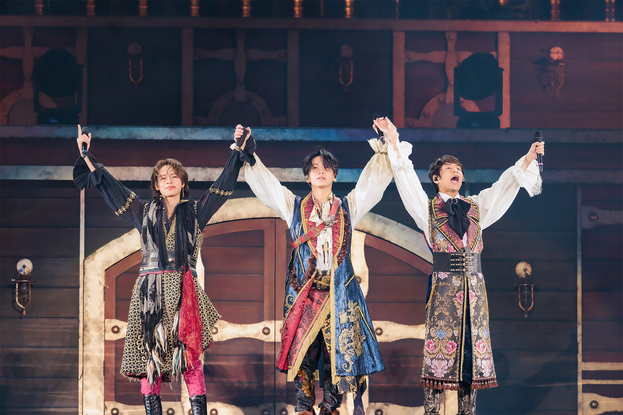 終盤へ向けてのラストスパート。フィナーレを彩ったのは、KAT-TUNの魂を焦がす炎のような情熱を描き出すような赤衣装。オープニング衣装同様の、3人それぞれの“らしさ”を象徴するシルエットに終始した。ジャガード、マトラッセ、ファー、ベルベットなど多彩に燃えたぎる深紅のなかに、不屈の“黒”が凛としてひときわ際を成す。その黒もそれぞれの眼差しを持つ。亀梨のジャケットの背を黒レースで妖艶に飾り、上田の黒いシャツはドレープで流れるようなひだを描き、中丸はしめやかに結ばれたネクタイにその黒があった。