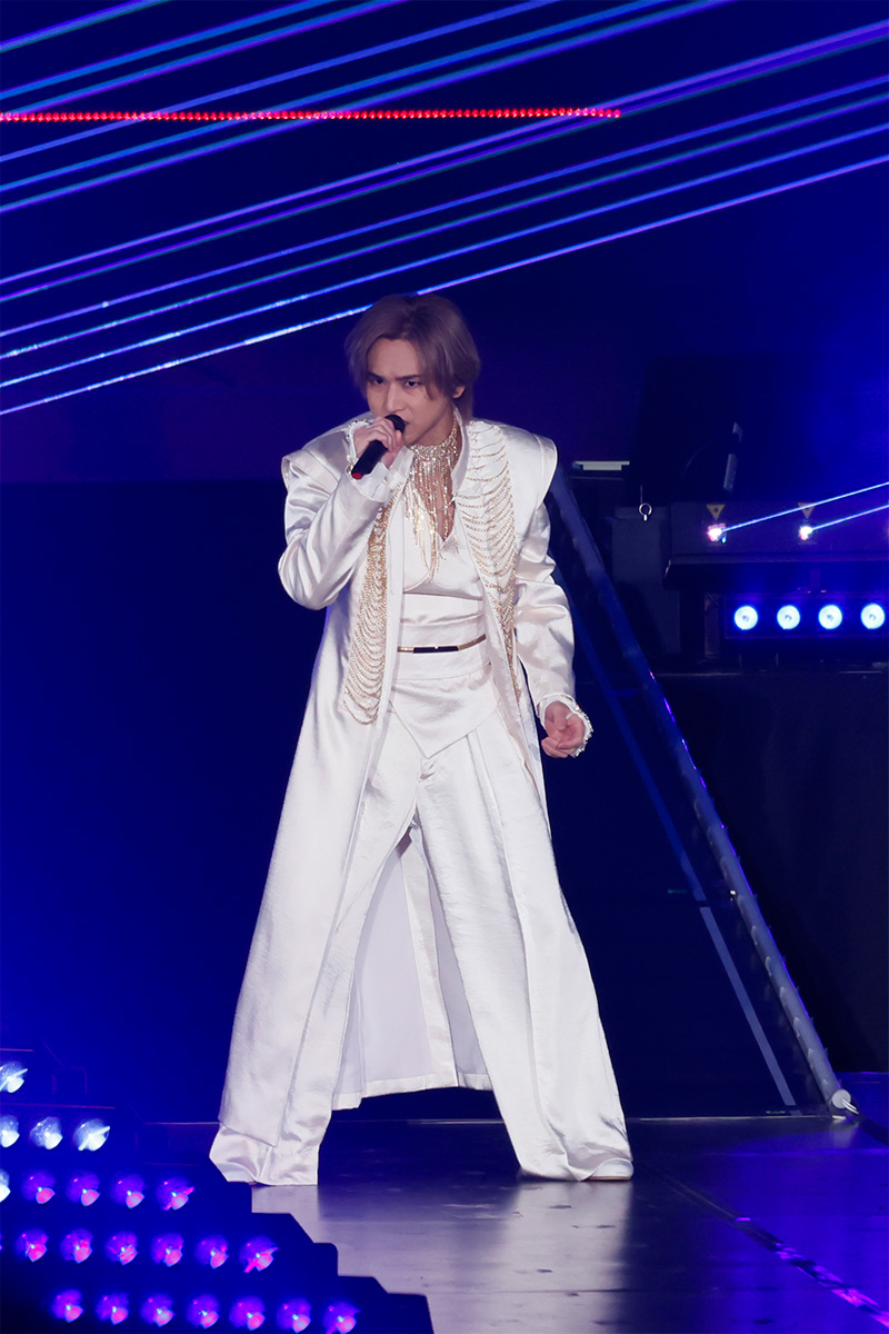 “ここからがスタートなんだ、ここから幕があがっていくんだよ”という思いが詰まっている『RAISE』のリード曲でもある「The begging of the world」からスタートだ。同曲のMVの世界観を引き継ぐ壮大な雰囲気のなか、体をすっぽりとマントに包み、フードを深くかぶった堂本がセンターステージに登場。そのまま花道をメインステージへと歩みを進めると、ひらりとそのマントを脱ぎすてて、純白の衣装をまとった神々しくも妖艶な姿を現すと、観る者は一瞬にして『RAISE』の世界へと引き込まれた。