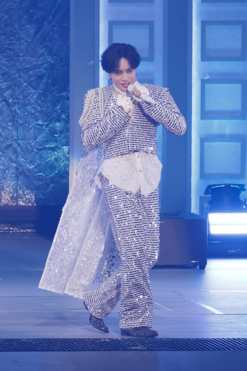 マントの肩から背中にかけては、今回のライブのモチーフにもなっている翼を銀糸の刺繍と黒いビーズ刺繍を重ねて立体的に表現。重厚感のあるメッシュ生地のスーツの袖口と前身頃にはレースアップの装飾が施された。首元の黒ネクタイには3連のチェーンネックレスを合わせ、マイクを握る右手の人差し指にはブルガリのリングが鎮座。小物使いの一点一点にまで美学が宿る装いで、バックステージ側のリフターで上昇し、「迷夢」を歌い上げた。