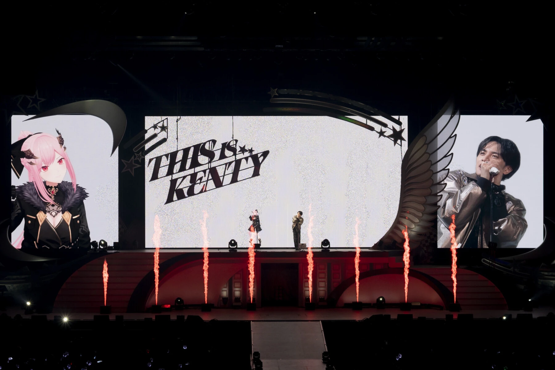 ラストスパートはキラキラのアイドルムード全開の楽曲をメドレーで披露。一番星を模した大きなオブジェに乗って姿を表した中島は、スカイブルーのセットアップを着用。この衣装は「JUST KENTY☆」MVのアニメーションを忠実に再現したもの。二次元に描かれていた衣服が、質感豊かなツイードや光沢を湛えた柔らかなシャツ、首元で圧倒的な存在感を放つリボン、そして左胸に煌めく星といった多彩なパーツによって、鮮やかな立体美で現れた。