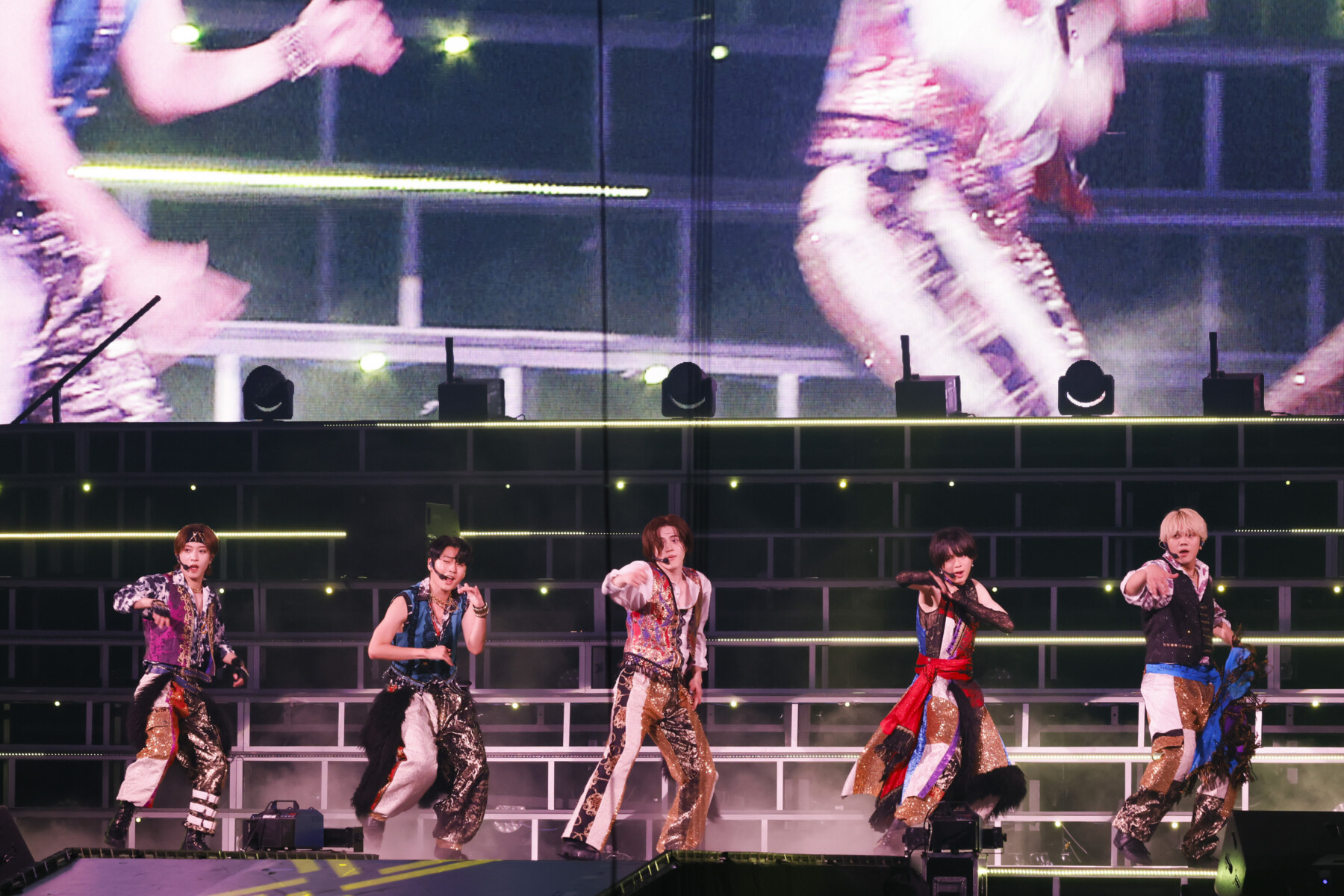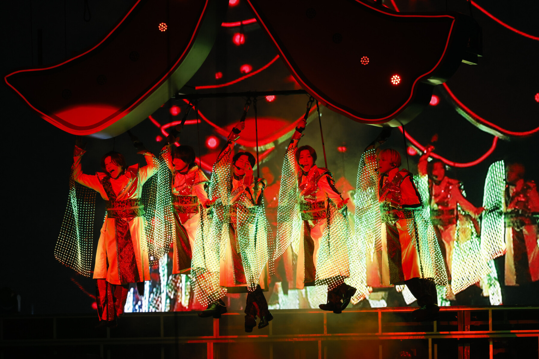 オープニングで登場した「天」のオブジェにぶら下がり、浮かび上がると、スクリーンの映像と本人たちの動きがシンクロし、5人が龍のように宙を舞う壮大な演出が繰り広げられた。和の衣装をまといながらも、最新テクノロジーで魅せる、ニュー&クラシックを体現するコーナーとなった。