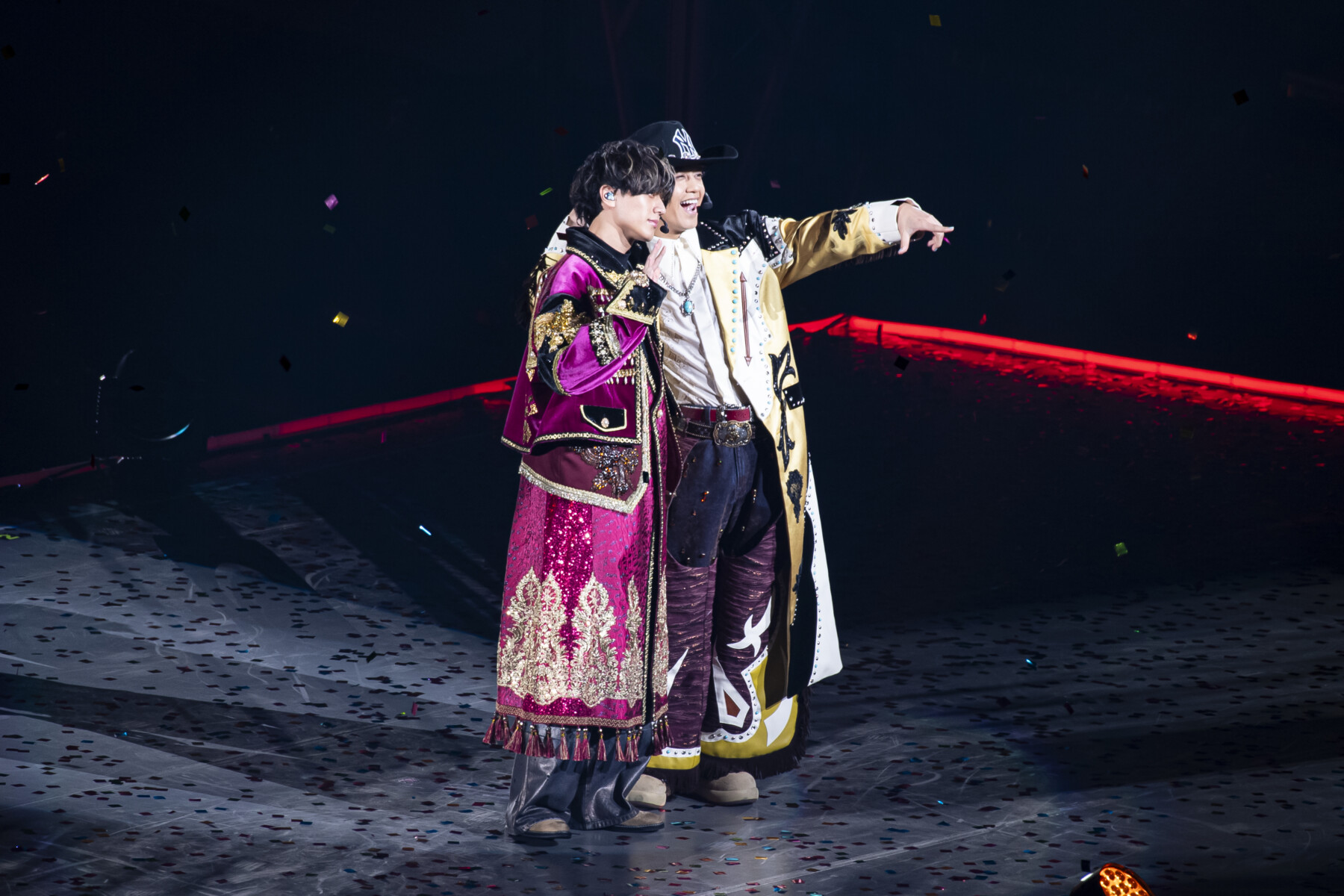 二人はそれぞれ、オリエンタルやウエスタンの要素を取り入れた衣装を身にまとい、1曲目に「Stereo Love」を歌唱。タワーからバックステージへ降り立つと、あっという間に次の衣装へと早変わりし、センターステージへと続く約100mのレッドカーペットを闊歩しながら話題の楽曲「Theater」を披露した。
