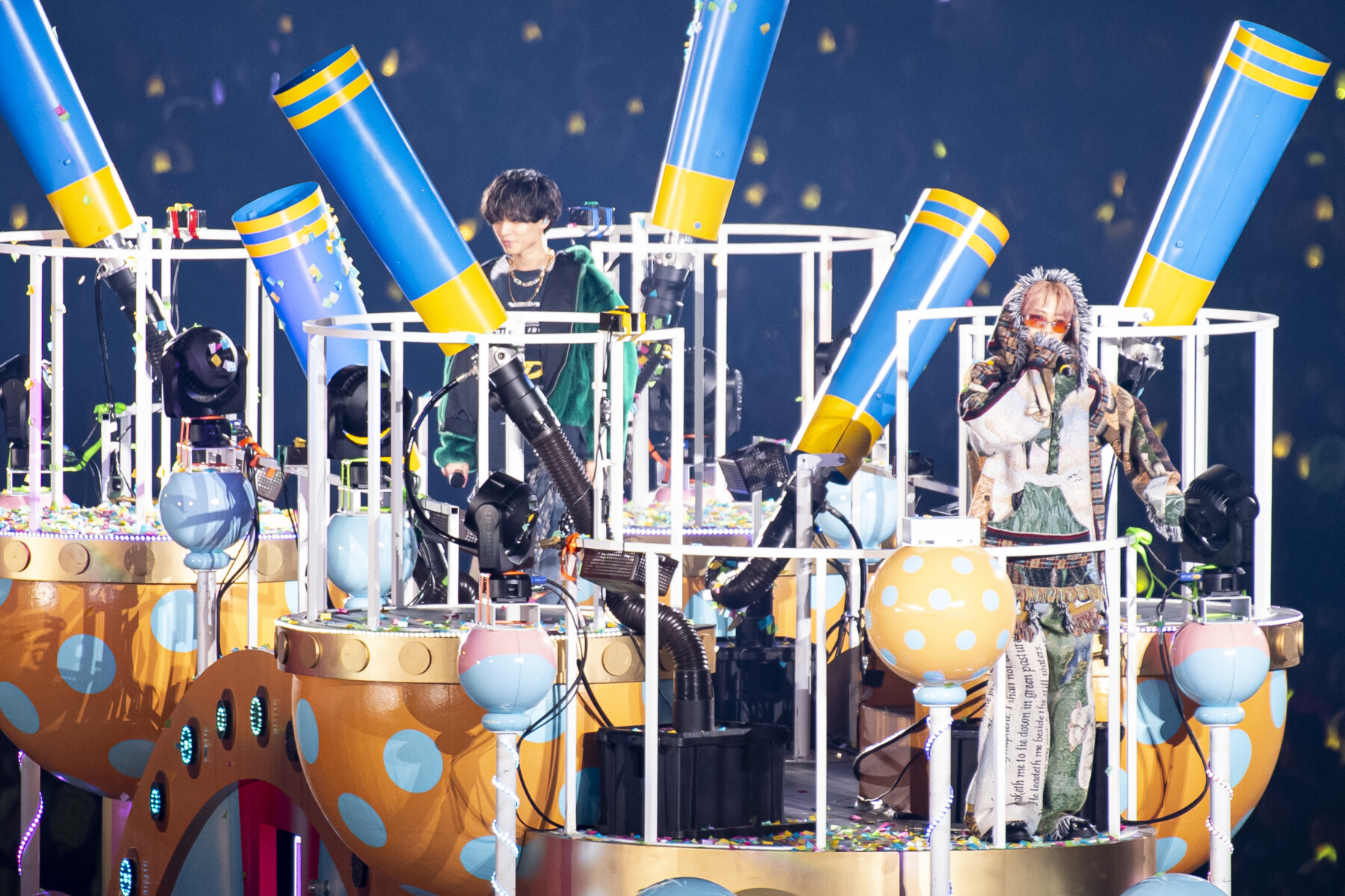 一方の城ノ内くんは、ダークグリーンのもこもこアウターにスポーティなグラフィックTシャツを合わせ、大胆なフリンジが全面に施されたデニムをコーディネート。ゴールドのチェーンネックレスが、彼らしい艶やかなスタイルを際立たせていた。二人はEDMソング「Harajuku」を披露するも、会場を一周しステージにたどり着く前に曲が終わってしまい「「気まじ~~」」と笑いを誘う一幕も。
