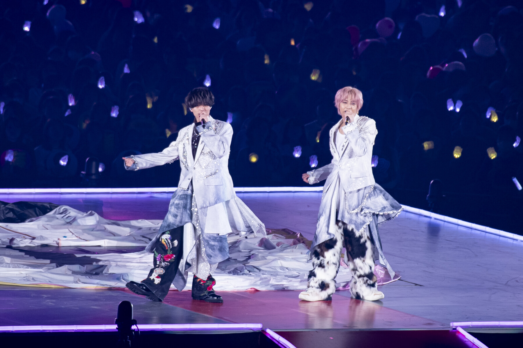 ひとときの間姿を消した後、ホワイトジャケットを脱いで異なるトップスへと衣装チェンジ。先ほど足元にちらりと見えていたポップなパンツの全貌が明らかになる。髙橋はボリューミーなファーパンツにホワイトのフーディーを合わせ、永瀬はさまざまなモチーフがあしらわれた奇抜なパンツにビジュー付きのレザージャケットを合わせていた。
