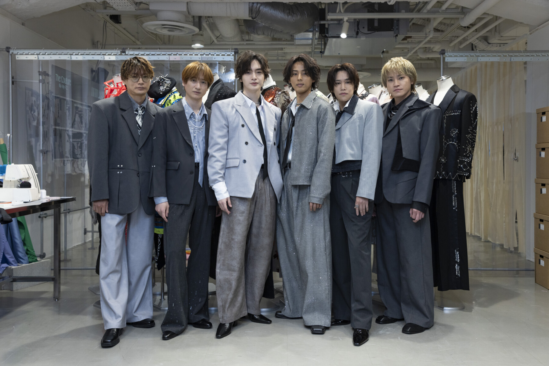 写真左から、横尾渉はビッグサイズのジャケットにスラックスを合わせてYラインを強調。宮田俊哉はブルーのタイ付きシャツにロング丈のパンツを合わせ、裾にたまりを作ることでミニマルなスタイルにニュアンスを添えている。玉森裕太はシャツの裾を折り返して、パワーショルダーのジャケットの裾を入れ込む高度な着こなしを披露。ナロータイ風のネックレスがほどよい抜け感を演出している。藤ヶ谷太輔は、唯一ジップアップジャケットを着用。タックの入ったワイドパンツと合わせ、ボトムにボリュームでアクセントを加えている。グレンチェックの生地と上品なラインストーンの装飾でさりげなくドレスップ。千賀健永はデニムジャケットにショート丈ジャケットを重ね、シャツの襟を外に出したレイヤードコーデ。二階堂高嗣は背面にセーラーカラーのようなディテールを備えた、重ね着風の構築的なジャケットを主役に据えた。