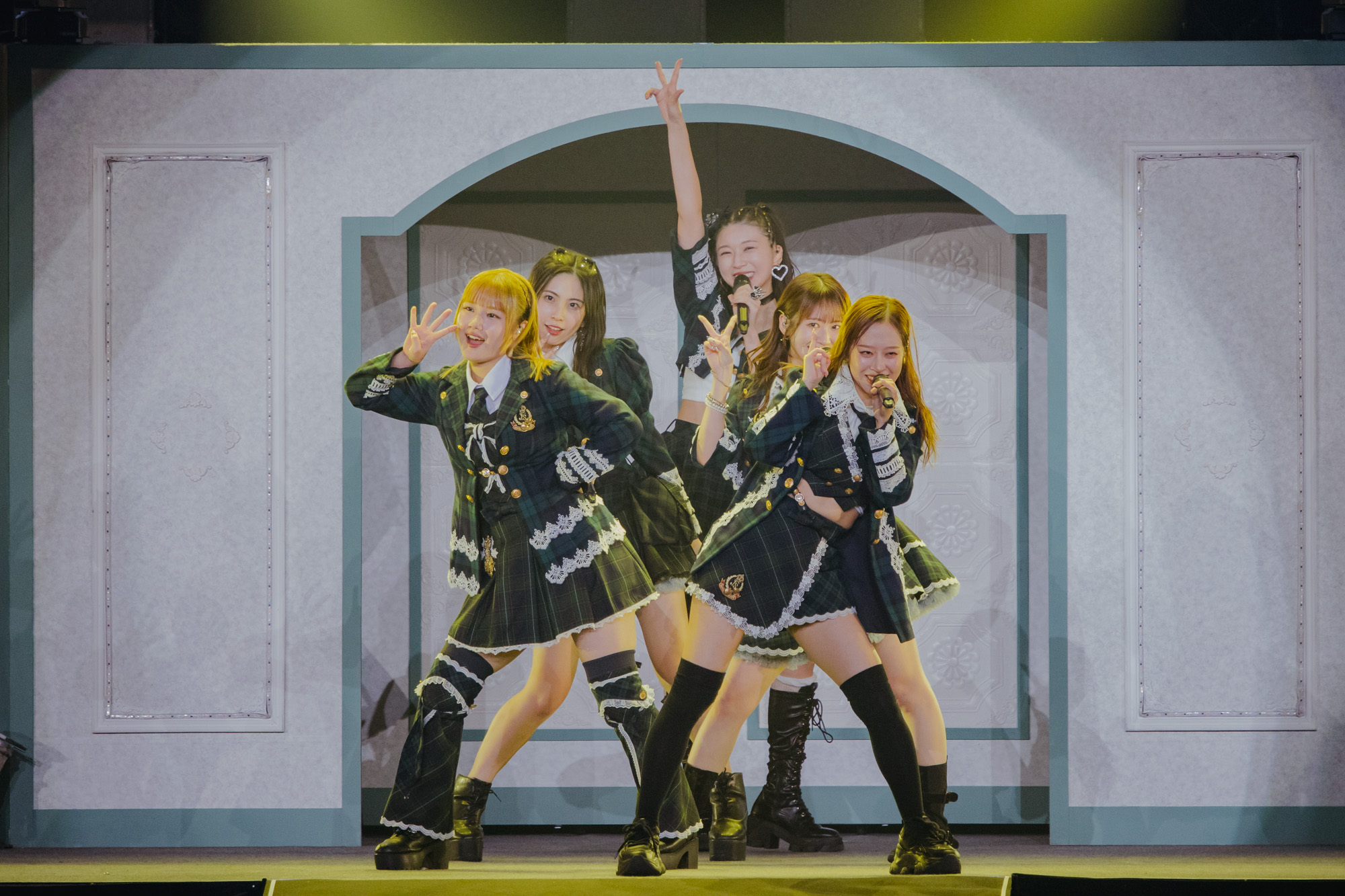 次に現れたのが、ネイビー〜グリーン系のタータンチェックを軸にしたプレッピースタイル。白シャツの襟と金ボタンが「制服」っぽさをつくりつつ、カフスの白いラインがレースになっていることで、手元にキュートで品のあるニュアンスが足される。しかもそのレースは、ぐるりと一周させず外側だけに配置。さらに、ボレロやブレザーなど、様々なタイプのジャケットが衣装のディティールをより魅力的に引き立てている。袖の切り替えやレースカフスの幅も微妙に違う。同じ“制服感”をまといながら、メンバーの個性を際立たせ、多くの表情を見せてくれたのだ。