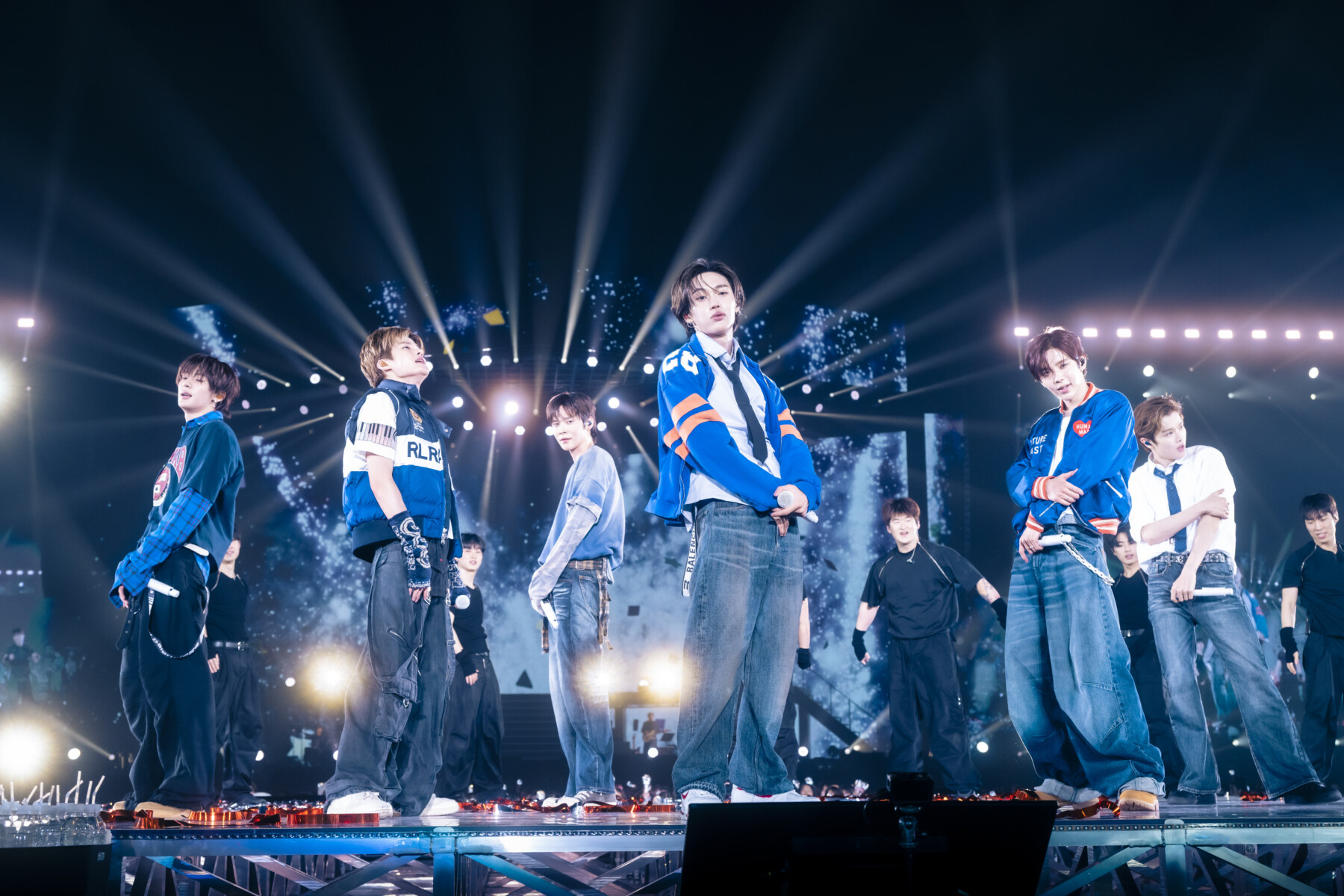 後半パートに入ると、鮮やかなブルーベースで合わせられた衣装で登場。ここでは、ショウタロウが、サテン生地の光沢感が特徴的なHUMAN MADE(ヒューマンメイド)のMA-1をワイドなデニムパンツと合わせ、抜群なスタイルをさらに際立たせていた。ソンチャンは、ペンシルストライプ柄にスタッズが装飾されているネクタイをポイントに、シンプルなデニムパンツとワイシャツを合わせたコーディネート。ウォンビンも同じく、ワイシャツにネクタイのスタイルで、オレンジのラインと背番号がプリントされたユニフォームデザインのパーカーと、BALANCIAGAのDリングベルトを合わせ、カジュアルスポーティーな雰囲気を着こなしていた。レイヤード風のトップスを着用したウンソクとアントンは、それぞれスタイリングのポイントにチェック柄をイン。ソヒは、袖にデザインされたシースルーの鍵盤がチャーミングな半袖Tシャツに、厚みのあるダウンジャケット、ニットのデミグラブを装着し、小物を効かせたエネルギッシュなコーディネートを着こなしていた。