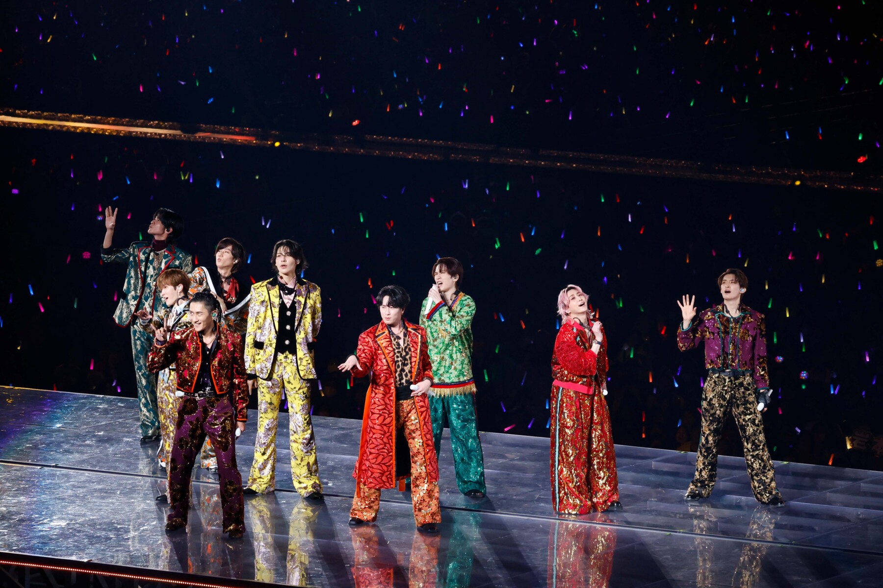 この衣装を着たSnow Manのパフォーマンスで最も印象深かったのは、「Dangerholic」でのポールダンス。歌いながらも体を宙に浮かせ、軽やかかつ優雅にくるくると舞うと、会場からは驚きと感動の拍手と歓声が広がった。アクロバティックはSnow Manの真骨頂。とはいえ、その新たな表現へ取り組むことをやめないチャレンジングな姿に、観る者の胸も熱くなる。公演中、タップダンスやコントなど、新たな表現へのトライによってさらに豊かなエンターテイメントを創り上げていた。