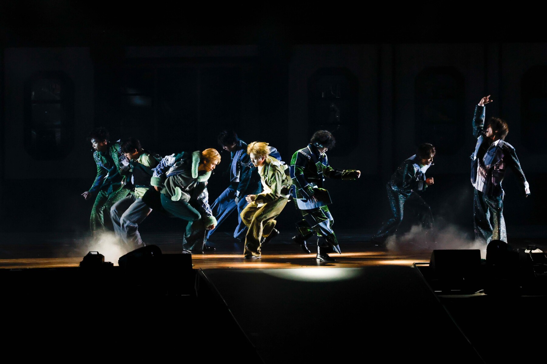 タイプロの映像に続き、課題曲でもあった「Anthem-episode1-」で再び姿を現したtimeleszは、ドーム公演のための特別な衣装「グリーンオリジナルデニム」衣装をまとっている。異なる様々なグリーンの素材とオリジナルのデニムを組み合わせたハイブリッドな衣装。菊池風磨は、濃淡グリーンのカラーブロックを大胆に配したオーバーサイズのジャケットとワイドパンツのセットアップ。しっとりとしたベロアがリュクスな印象に。佐藤勝利のラウンドネックの首もとにはリボンタイがポイントに、アシンメトリーな切り替えたオールインワンで断トツの可愛らしさを誇る。松島聡はオーバーサイズの変形Gジャンのインにストライプシャツで知的さをプラスしたレイヤードスタイル。寺西拓人は柔らかなエメラルドグリーンのシャツと美しいシルエットのジャケットにデニムのワイドパンツを合わせたコーディネートを、抜群のスタイルで着こなした。原嘉孝はフレッシュに煌めく若草色のセットアップで目を引き。橋本将生のピンストライプのセットアップはデニムをポイント的にドッキングさせて小粋に。猪俣周杜は大きな襟のカジュアルなジャケットに、セクシーなペールトーンの開襟シャツを合わせ絶妙なコントラストを奏でている。存在感を放っていたのが、篠塚大輝のコート。襟や袖口にあしらわれた瑞々しいミントグリーンのファーが目を引き、高身長の篠塚のダンスをダイナック彩った。グラデーションになったデニムのパッチワークも洒落ている。