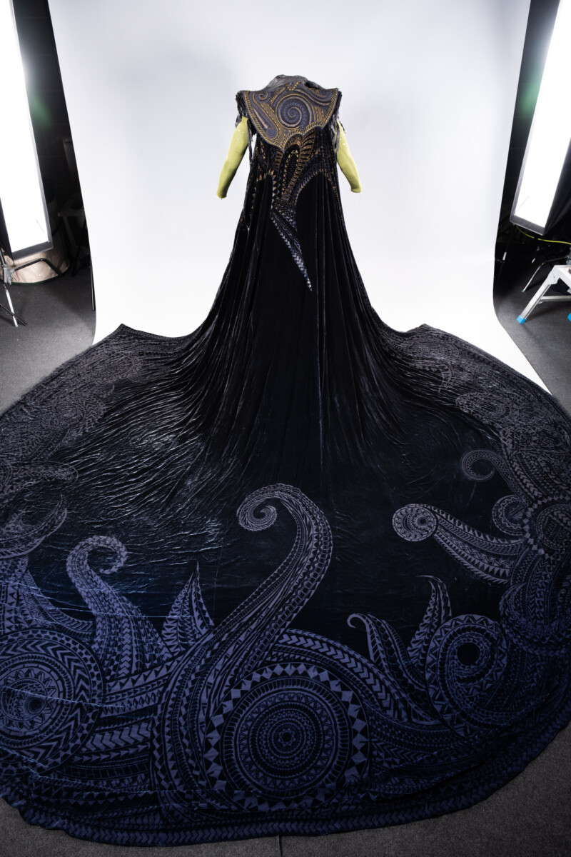 新たに登場する、青から黒へと変化するぼかし染めが印象的な「キアモ・コ城」のマント。肩や胸、背中、腰などの切り替え部分には錦糸の刺繍が、裾などの縁取りには民族調の唐草模様が施されている。