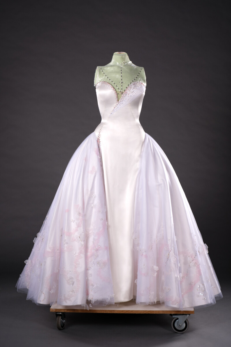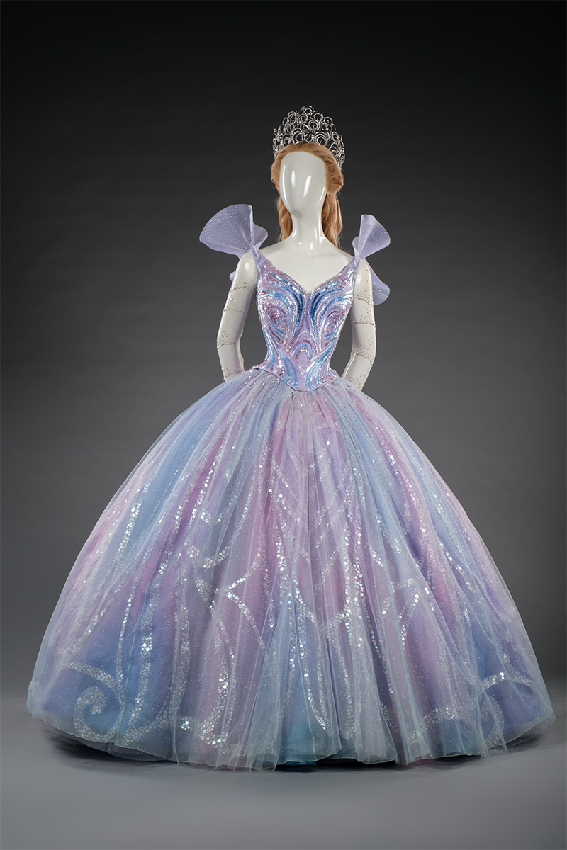 曲線美や柔らかさによって、フェミニンな強さと魅力が表現されたグリンダのバブルドレス。ロココやディオールのニュールックなど、歴史的なドレスのシルエットのほか、花びらの構造に見られるフィボナッチらせんがデザインに取り入れられた。シャボン玉やオーロラを思わせるカラーは、優美で幻想的なグリンダのキャラクター像を演出する。