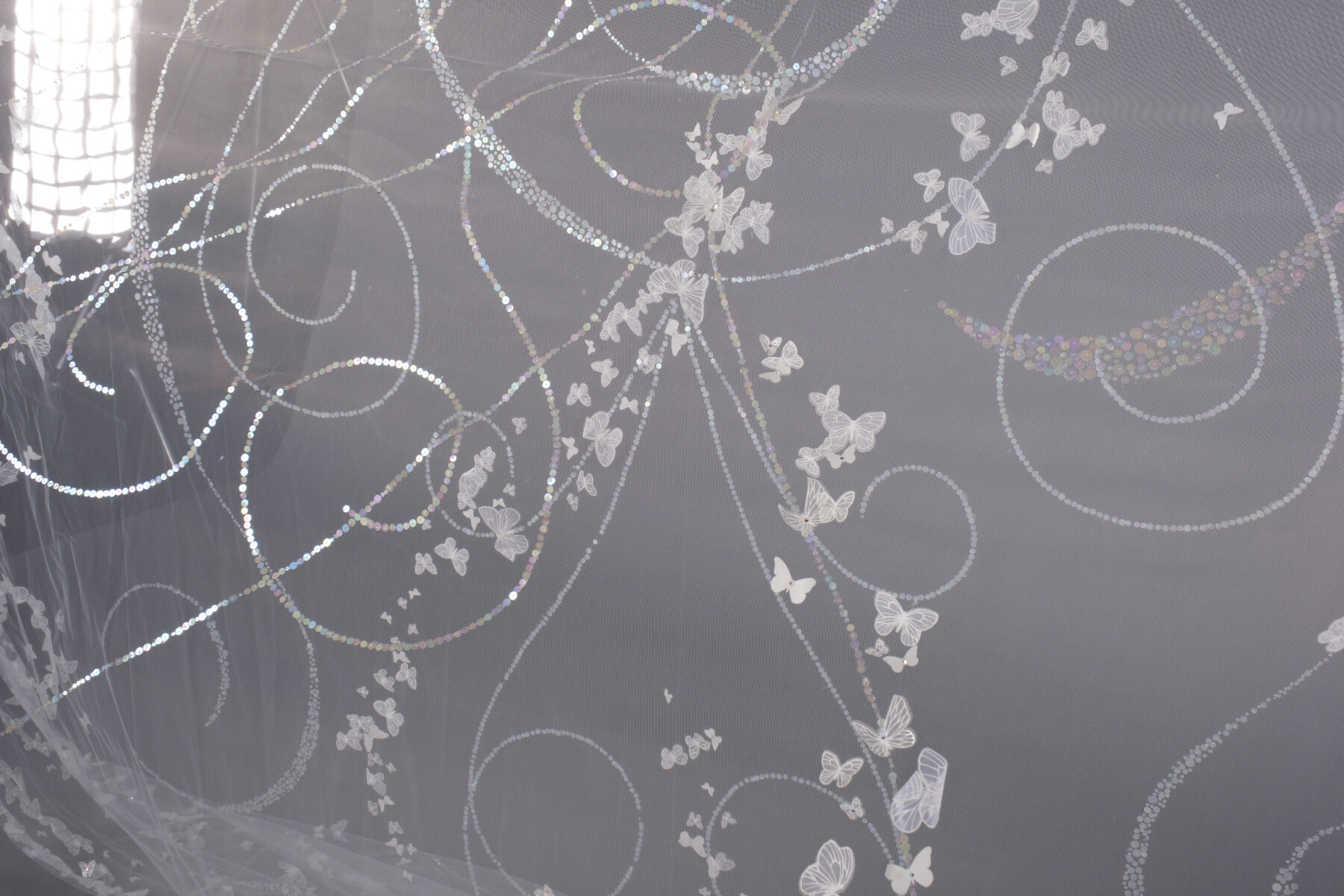 チュールで作ったベールは蝶の刺繍で縁取り、そのことによって25メートルものベールが生きているような印象になりました」