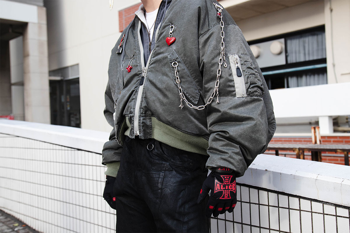 ボンバージャケットを主役にコーディネートしました。さし色の赤がポイントです。