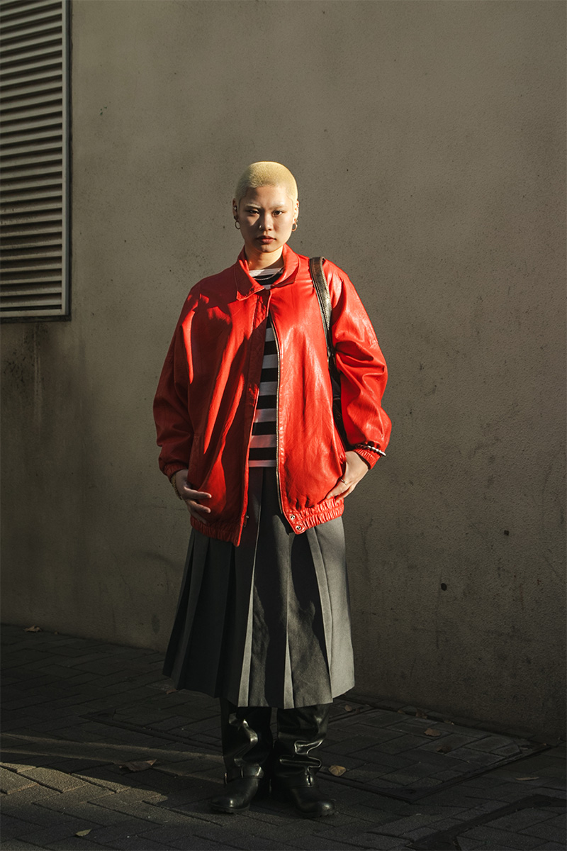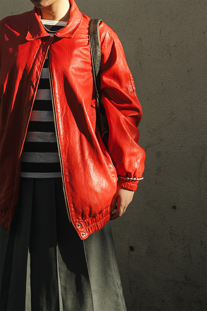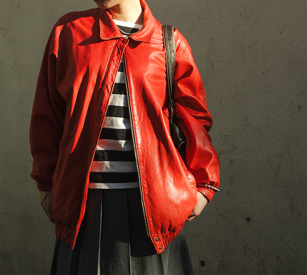 クリスマスを意識した赤のジャケットと、ボーダーのトップ