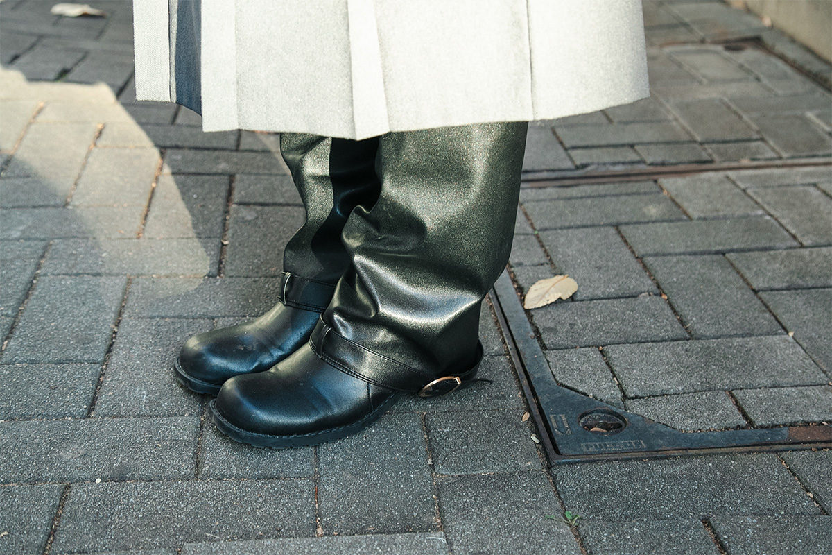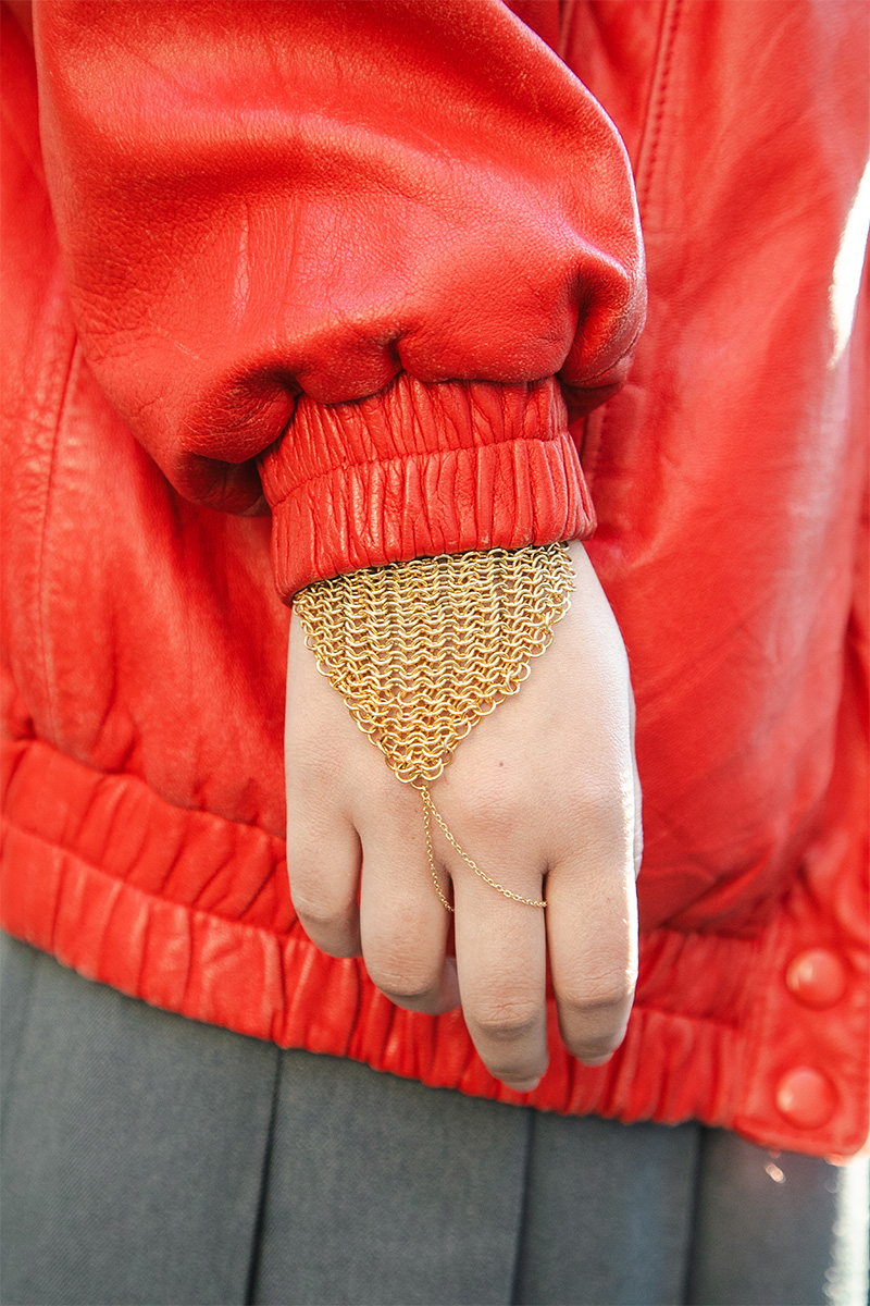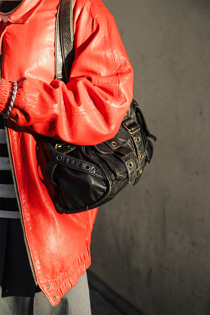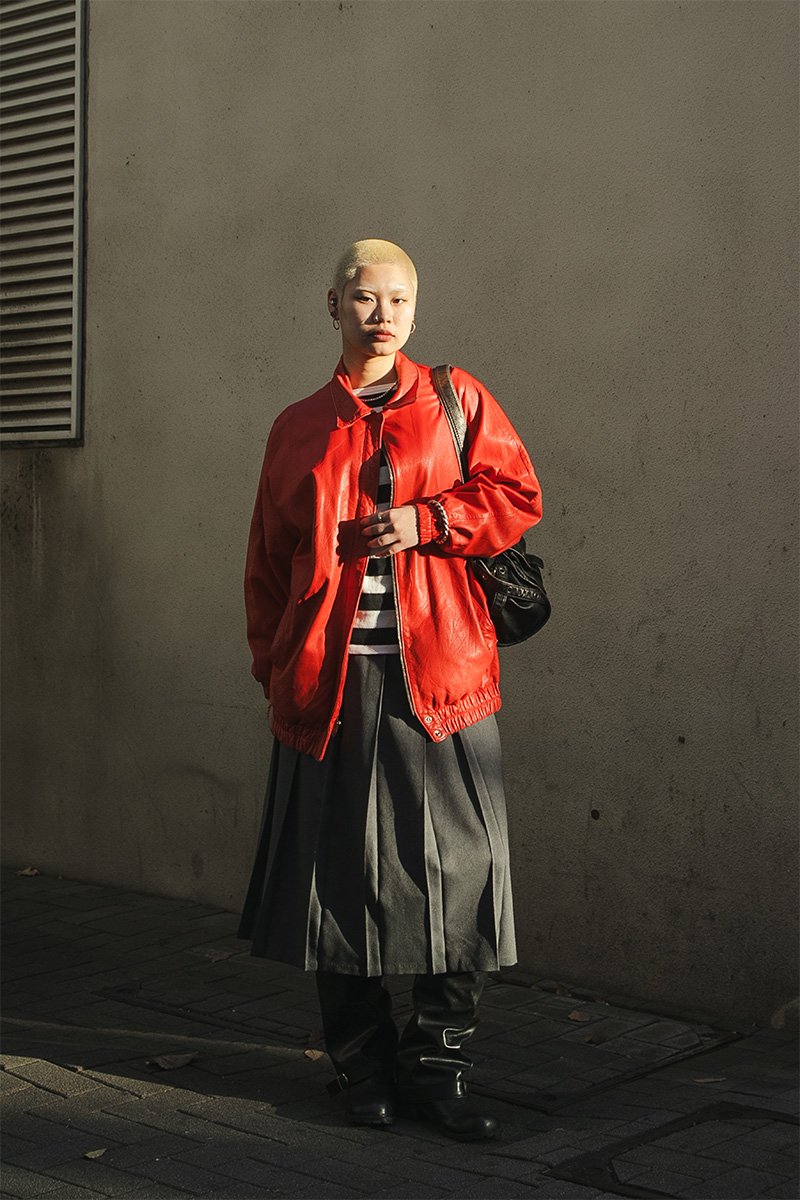 クリスマスを意識した赤のジャケットと、ボーダーのトップ