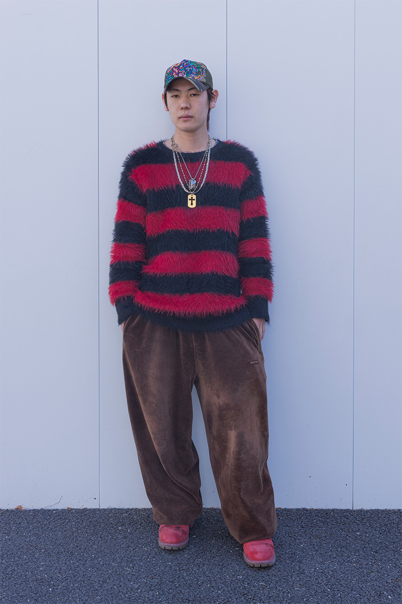 また、帽子の迷彩柄のくすんだ色味にあわせてパンツを選んだのもポイントです。