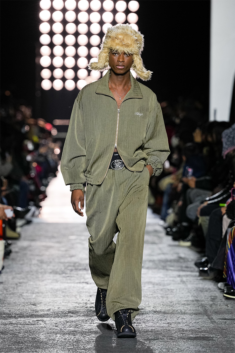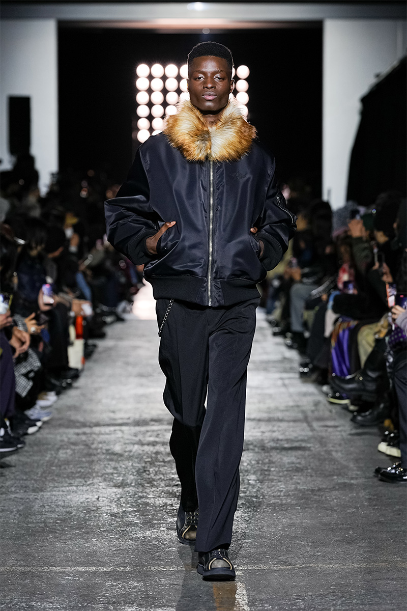 神谷康司がデザイナーを務めるKAMIYA(カミヤ)が、2月13日(金)、2026年秋冬コレクションをランウェイ形式で発表した。会場となったのは、東京・新木場の「GARDEN 新木場 FACTORY」。シカゴのラッパー、トビ・ルー(Tobi Lou)のライブパフォーマンスによる軽快なヒップホップサウンドが無機質な空間を満たす中、ファー付きのMA-1ジャケットに端正なテーラードパンツを合わせたモデルが登場し、ショーの幕が開いた。