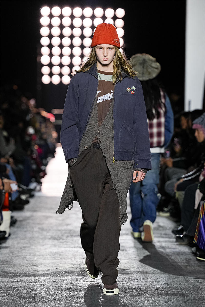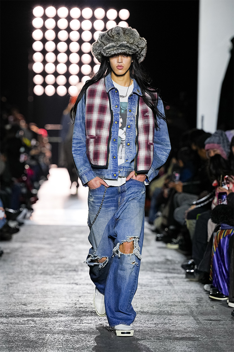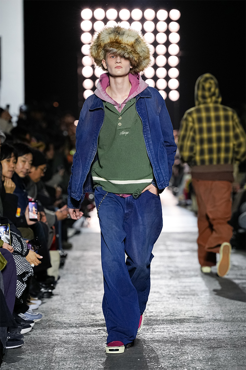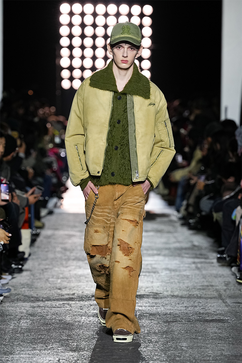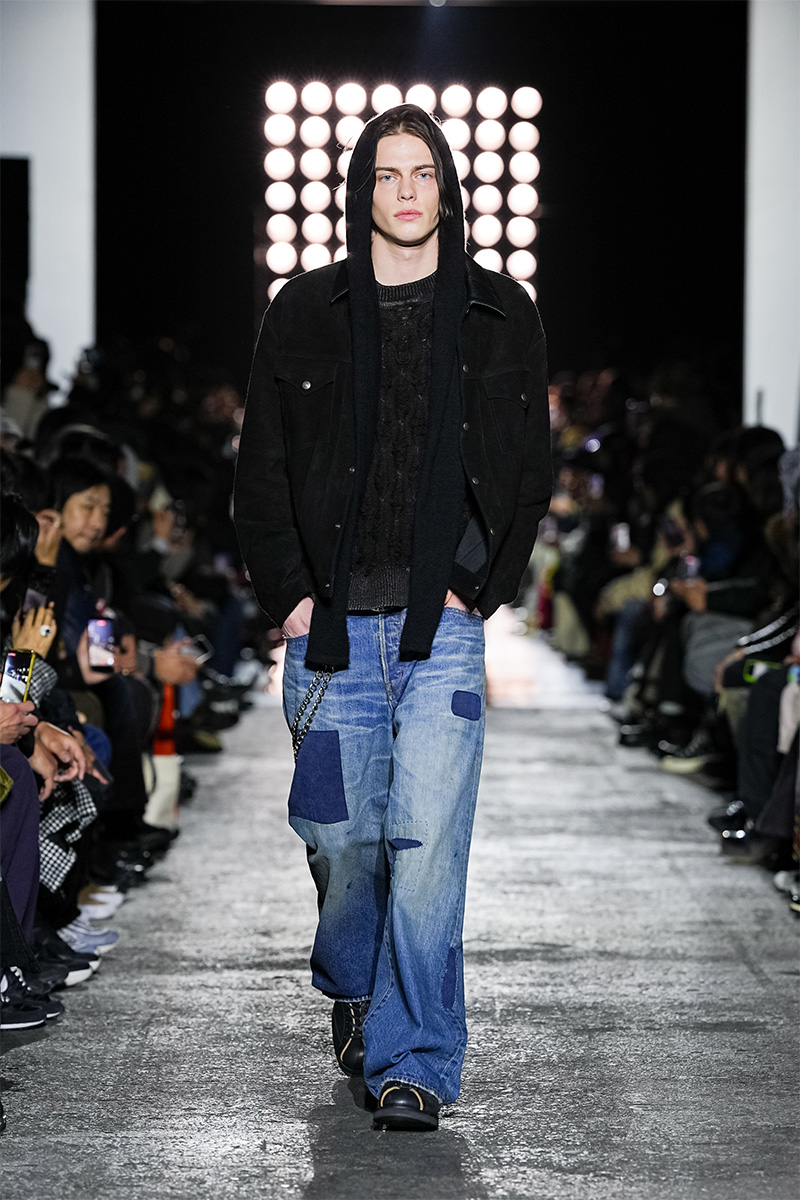 ブランドの代名詞であるヴィンテージ加工も一層の冴えを見せる。前シーズンに支持を得た三重ガーゼ生地にバンダナ柄をのせたワークジャケット、中綿入りのベストやパンツをはじめ、オリジナルロゴを配したコンパクトなフーディ、グランジ感漂うダメージカーディガンなどが次々と登場。シグネチャーのデニムには緻密な色落ちやクラッシュ加工が施され、パンツはワイドやフレアシルエットを腰穿きするスタイルがランウェイを彩った。