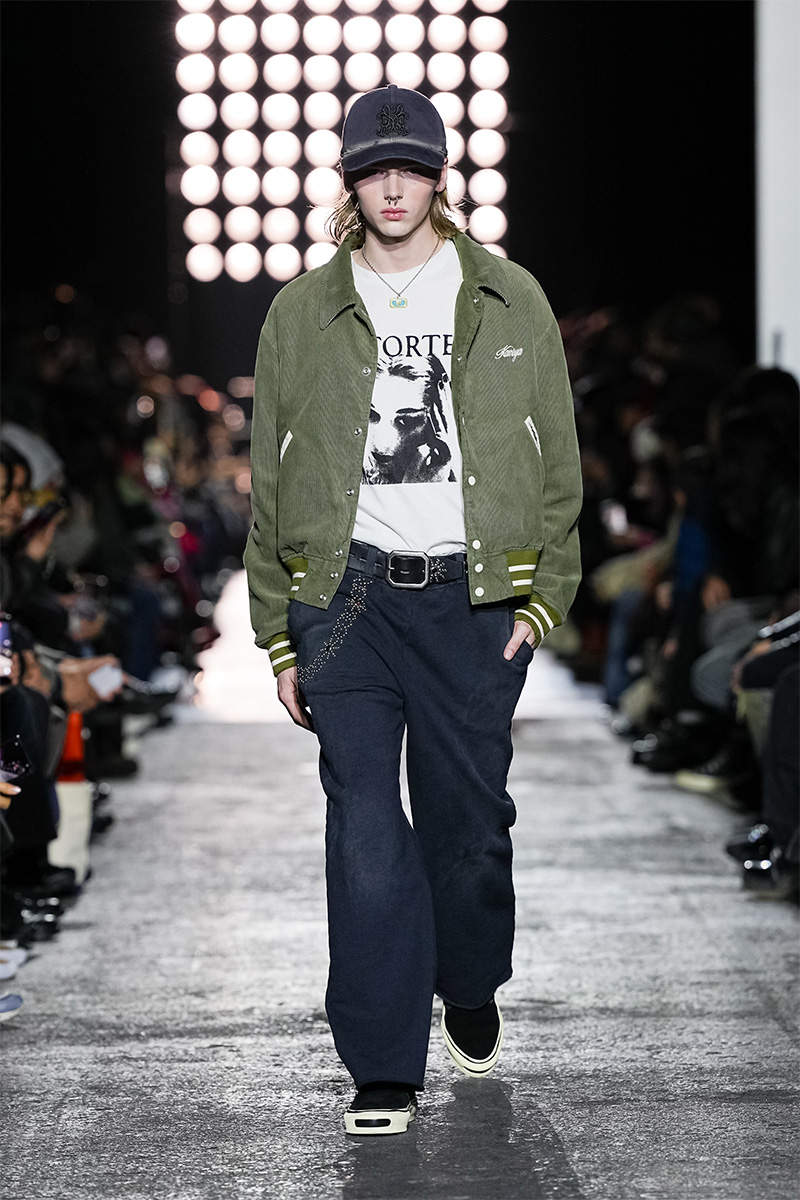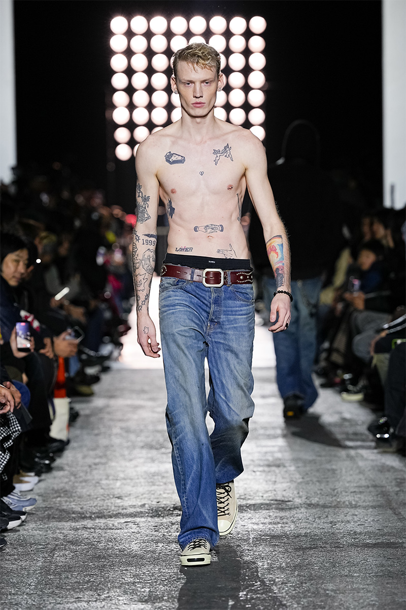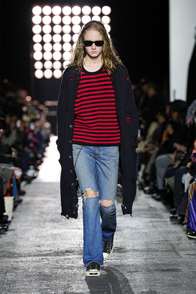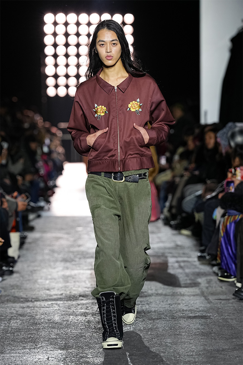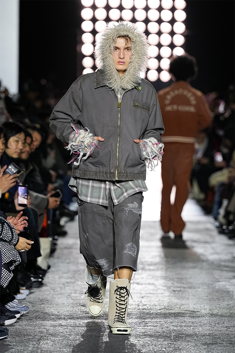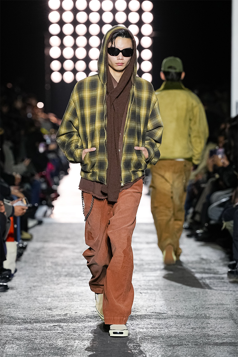 ブランドの代名詞であるヴィンテージ加工も一層の冴えを見せる。前シーズンに支持を得た三重ガーゼ生地にバンダナ柄をのせたワークジャケット、中綿入りのベストやパンツをはじめ、オリジナルロゴを配したコンパクトなフーディ、グランジ感漂うダメージカーディガンなどが次々と登場。シグネチャーのデニムには緻密な色落ちやクラッシュ加工が施され、パンツはワイドやフレアシルエットを腰穿きするスタイルがランウェイを彩った。