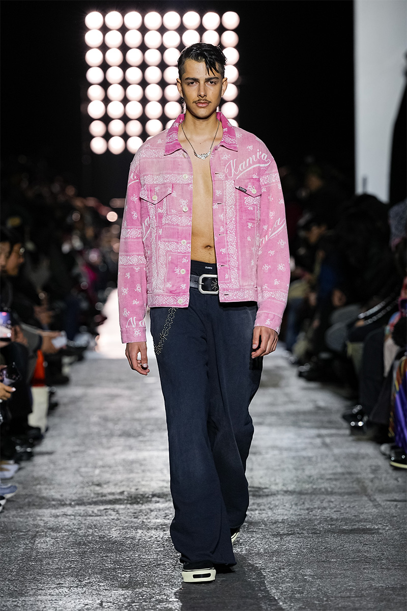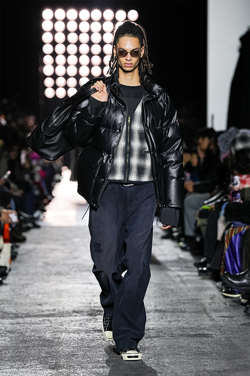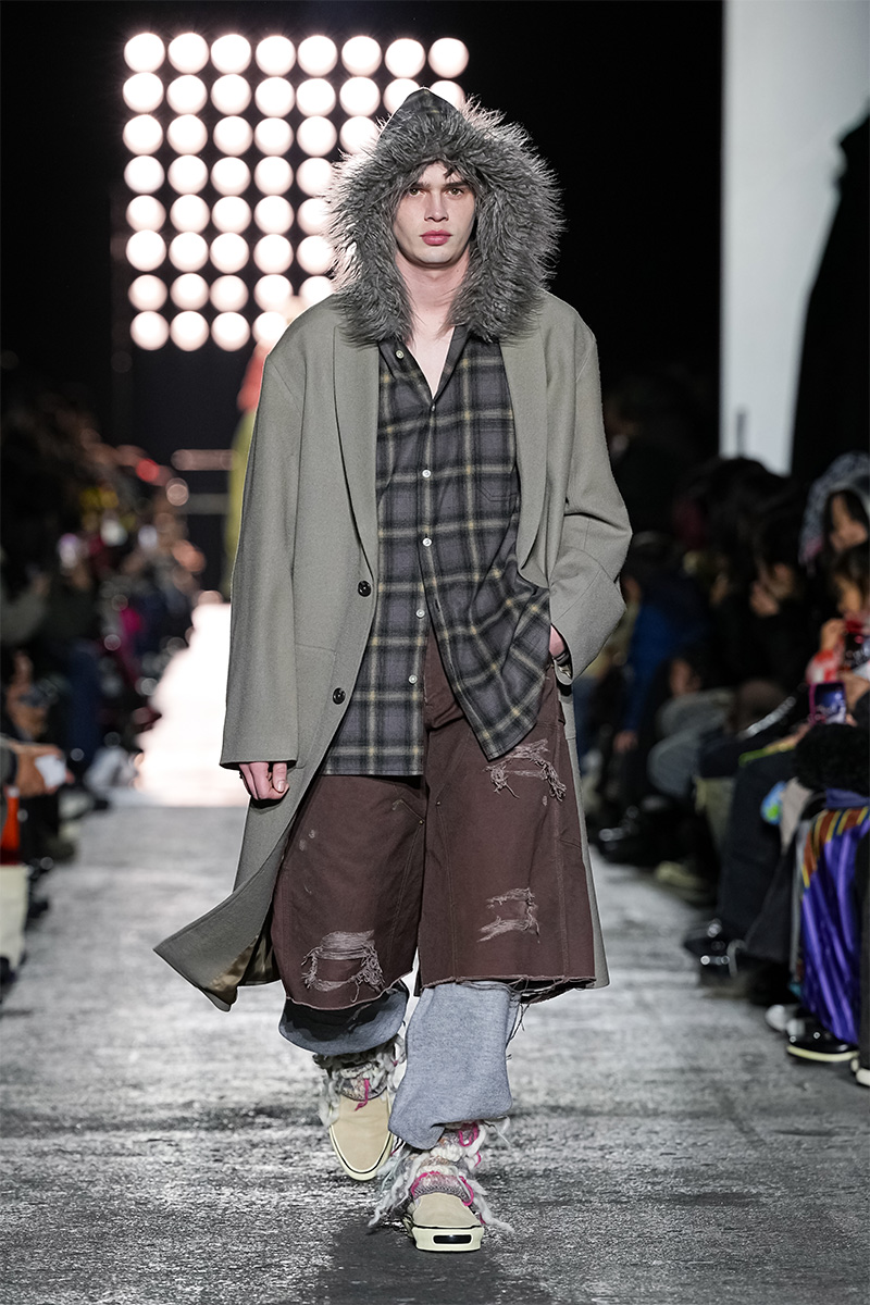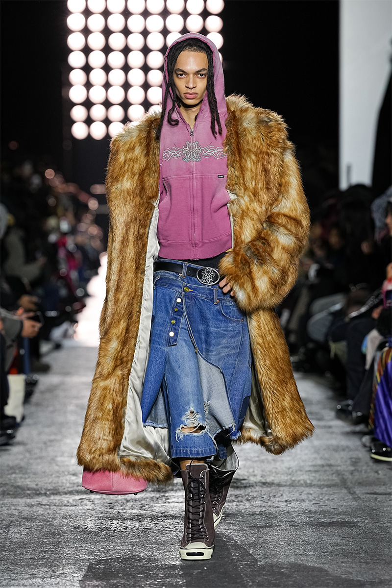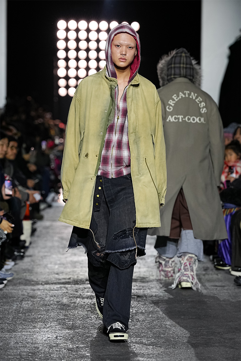 ブランドの代名詞であるヴィンテージ加工も一層の冴えを見せる。前シーズンに支持を得た三重ガーゼ生地にバンダナ柄をのせたワークジャケット、中綿入りのベストやパンツをはじめ、オリジナルロゴを配したコンパクトなフーディ、グランジ感漂うダメージカーディガンなどが次々と登場。シグネチャーのデニムには緻密な色落ちやクラッシュ加工が施され、パンツはワイドやフレアシルエットを腰穿きするスタイルがランウェイを彩った。