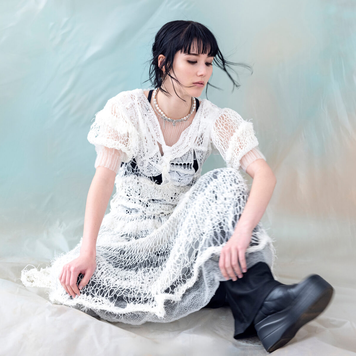 コレクションの終盤に登場したモヘアのローゲージのドレスは、ODAKHAのアイコンとなるコレクションピースのアイテム。毎回編地などに工夫を凝らして発表される。今回は白とラベンダーの2色のドレス。2枚のドレスを重ねたときに見える透け感や、暖かい光を閉じ込めたようなモヘアの質感が特徴となっていた。