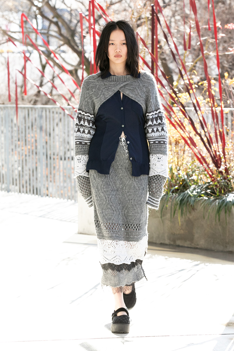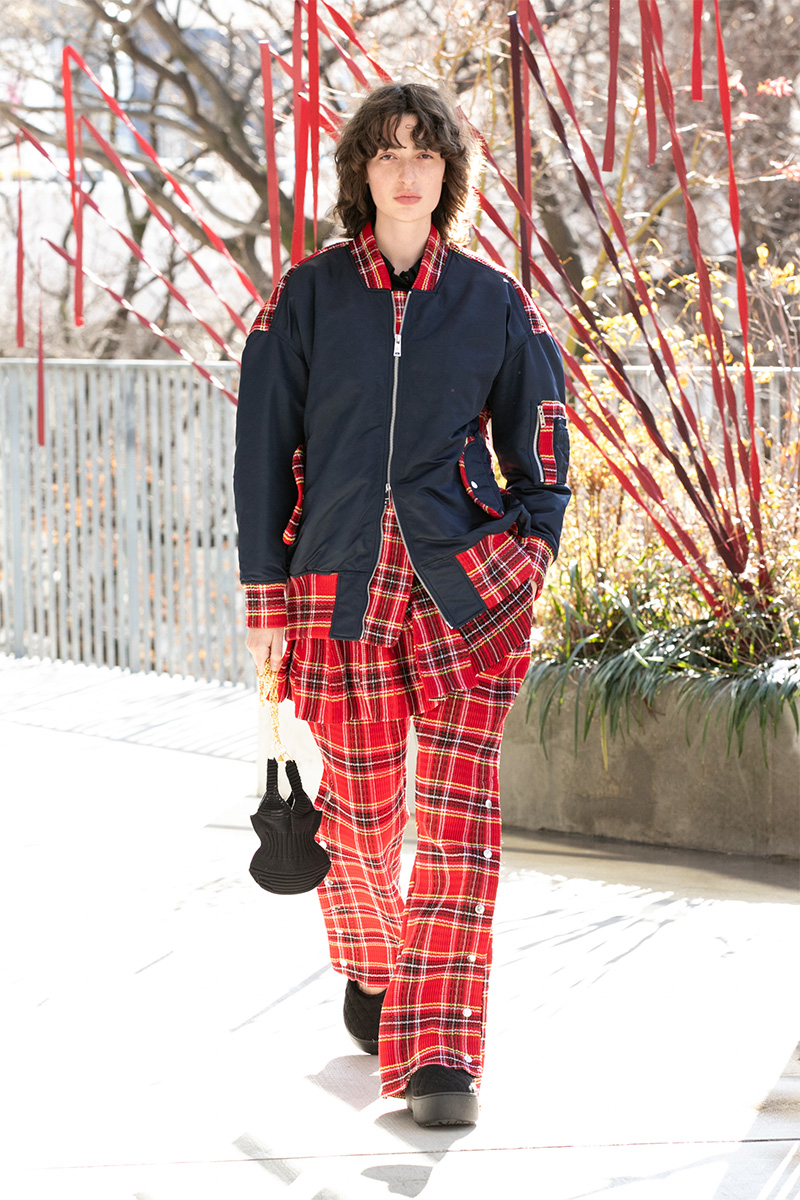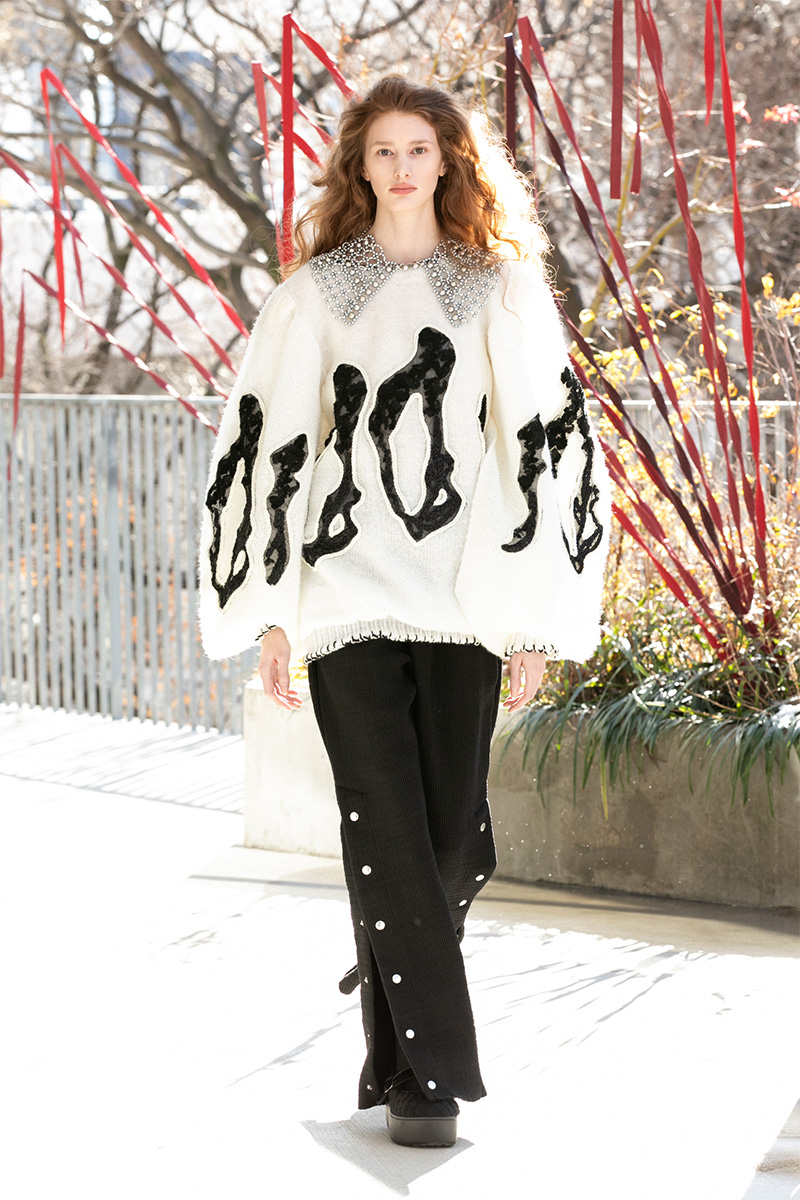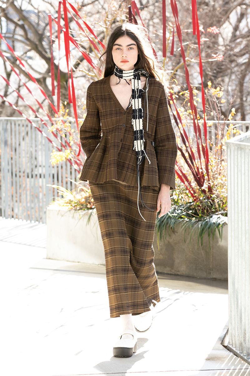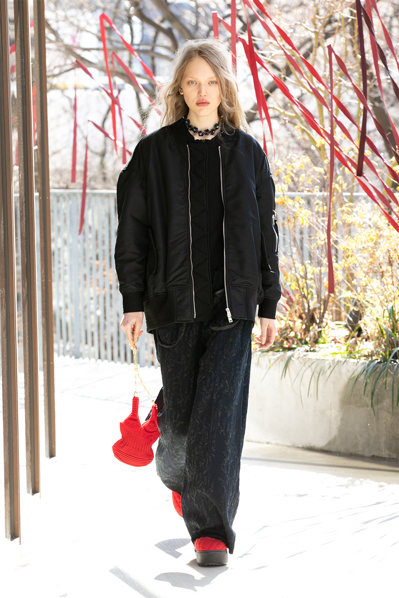 甘さを控えたロマンティックなニットのルック。ストレートなパンツをスタイリングした少しボーイッシュなリック。すべてのルックには丸みを帯びたSUBUとのコラボレーションの靴がコーディネートされていた。