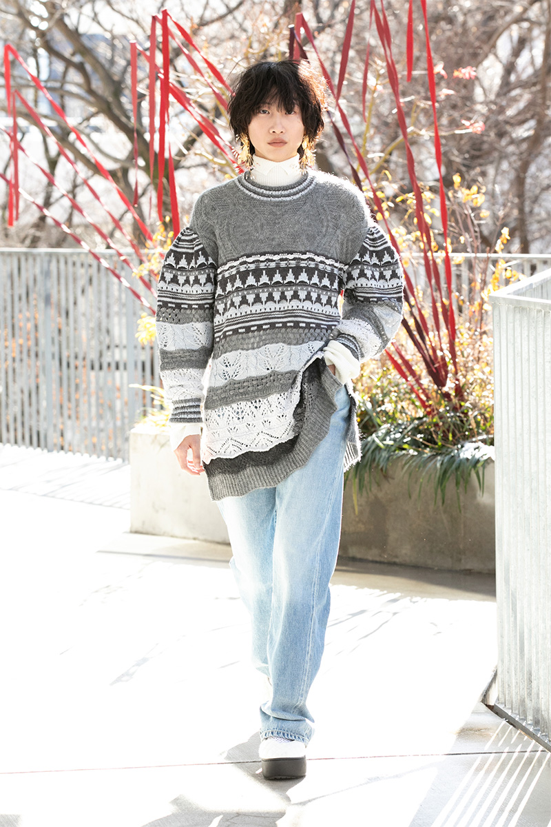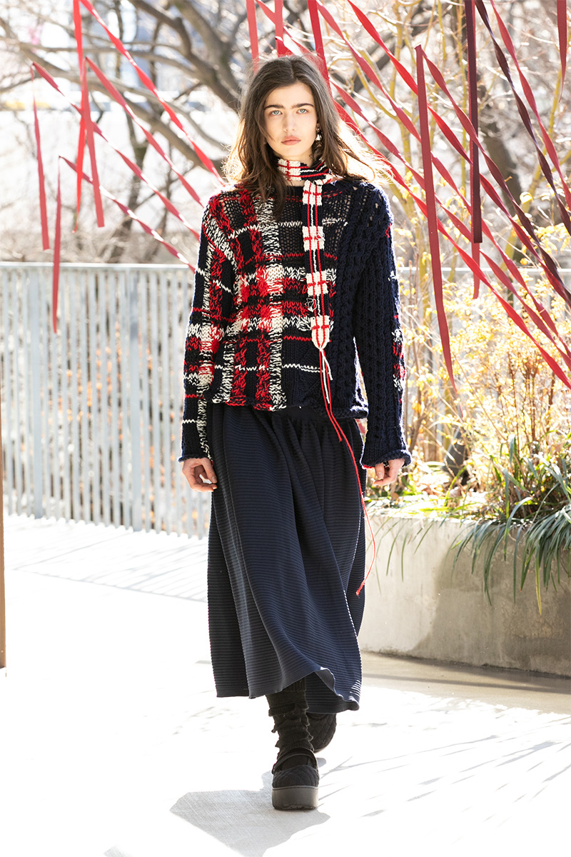 スコットランドといえばタータンチェック。そのタータンチェックをニットで立体的に見せたアイテム。アシンメトリーに配されたチェック柄は、ともするとやや未完成な趣きを見せ、さらには完成直前のニットの緊張感も伝わる。儚く危うい糸の表情が唯一無二の魅力へと変わる。