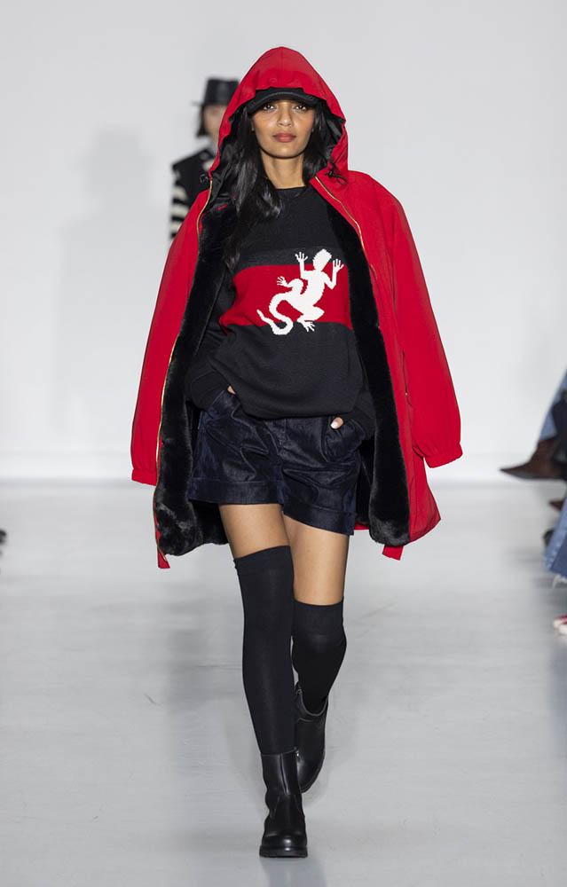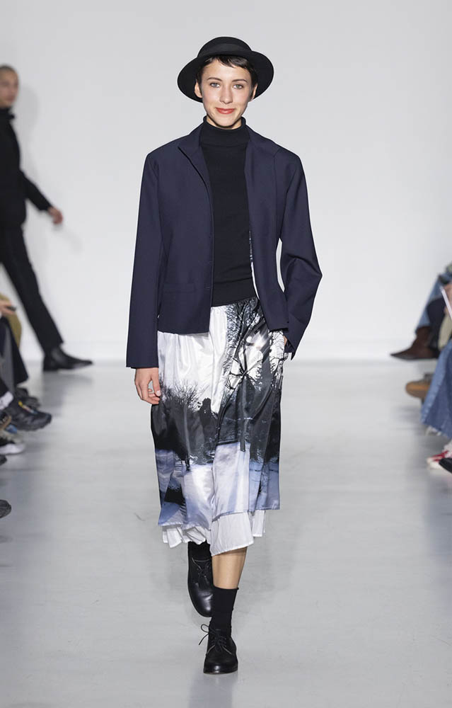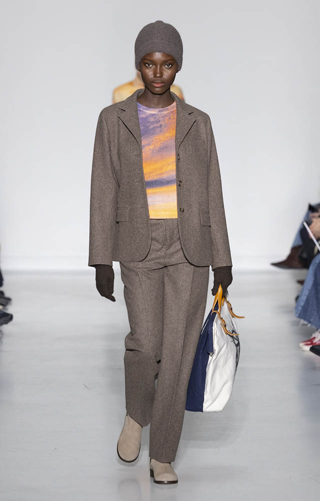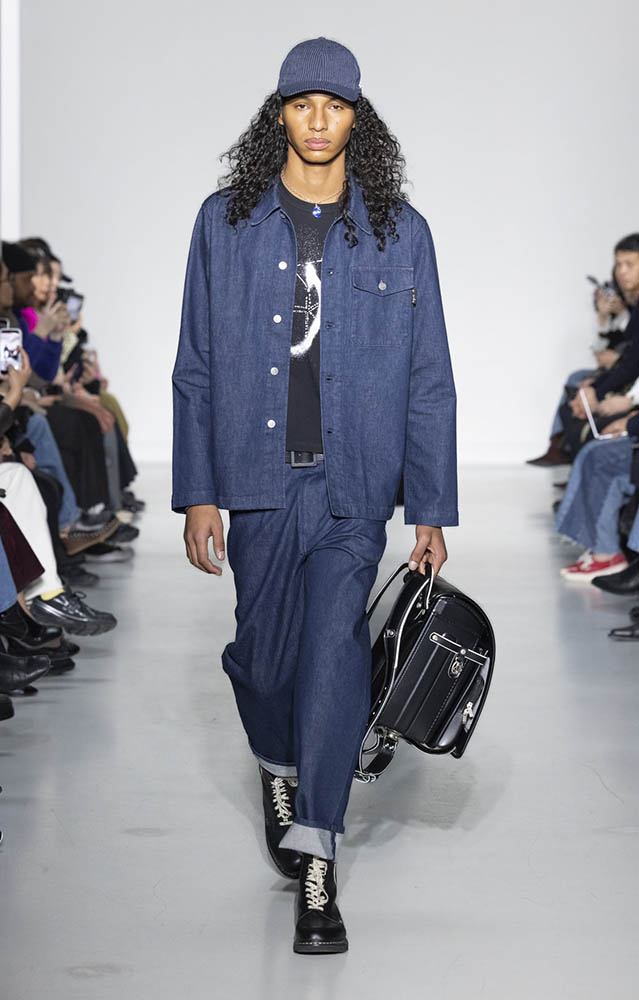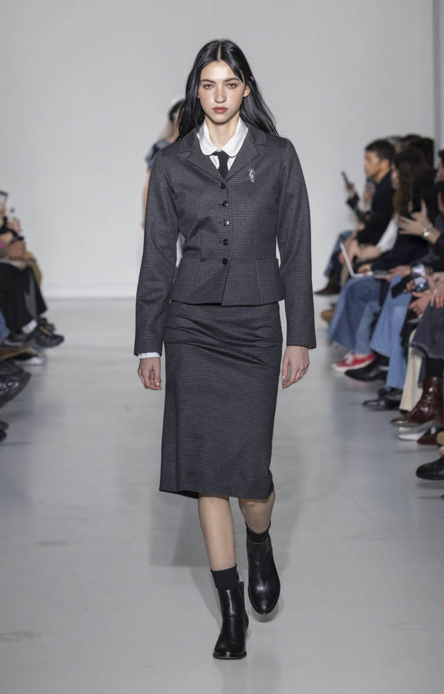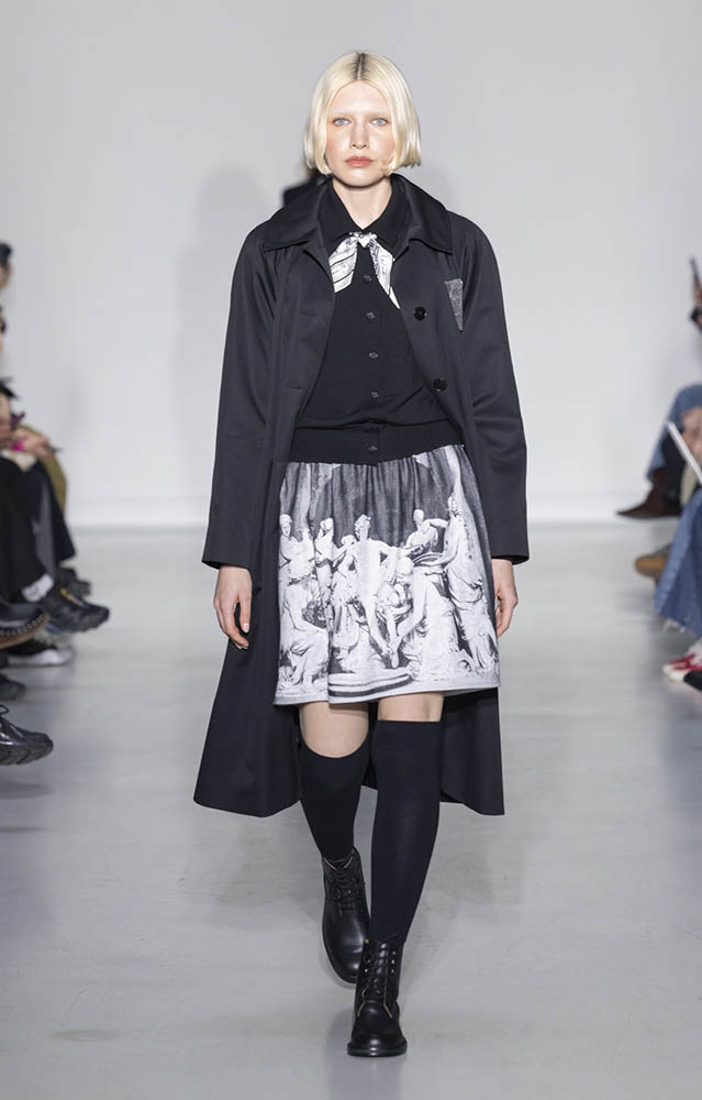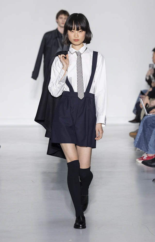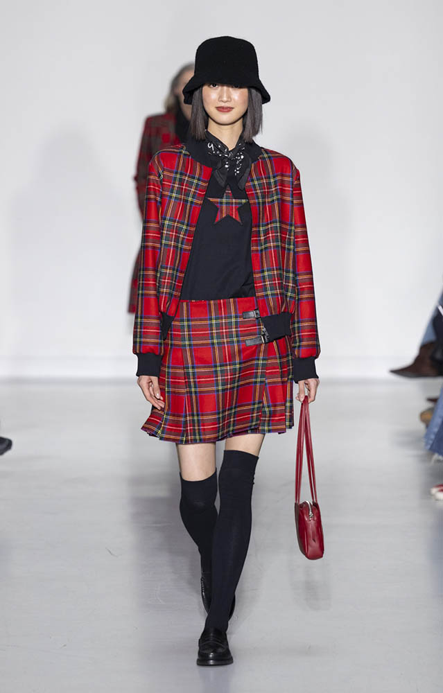 パリの本社で開催されたショーでは、スクールユニフォームを思わせるルックが多数展開され、ランドセルを持ったモデルも登場。定番のボーダー、タータンチェック、雪景色の写真のプリントが目を引くコレクションです。