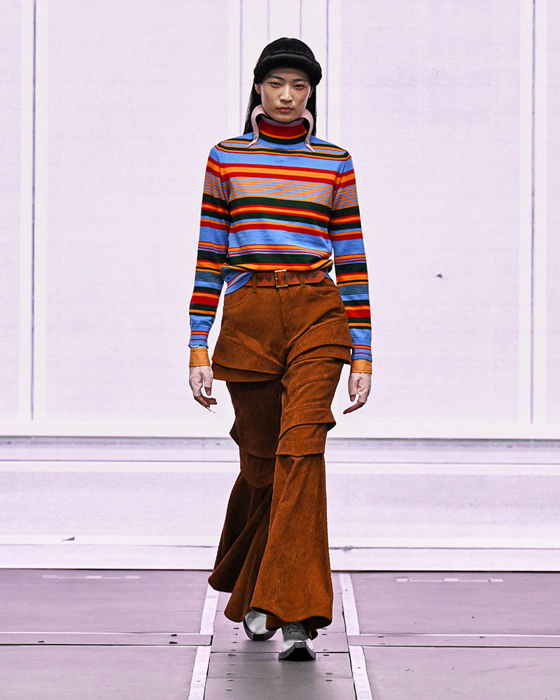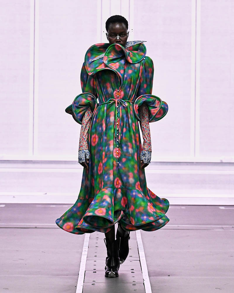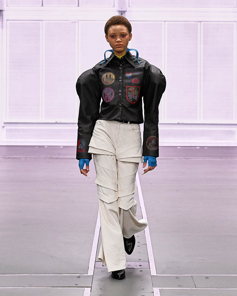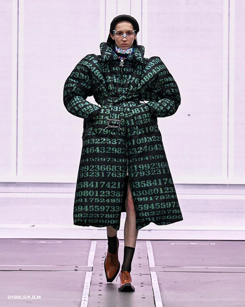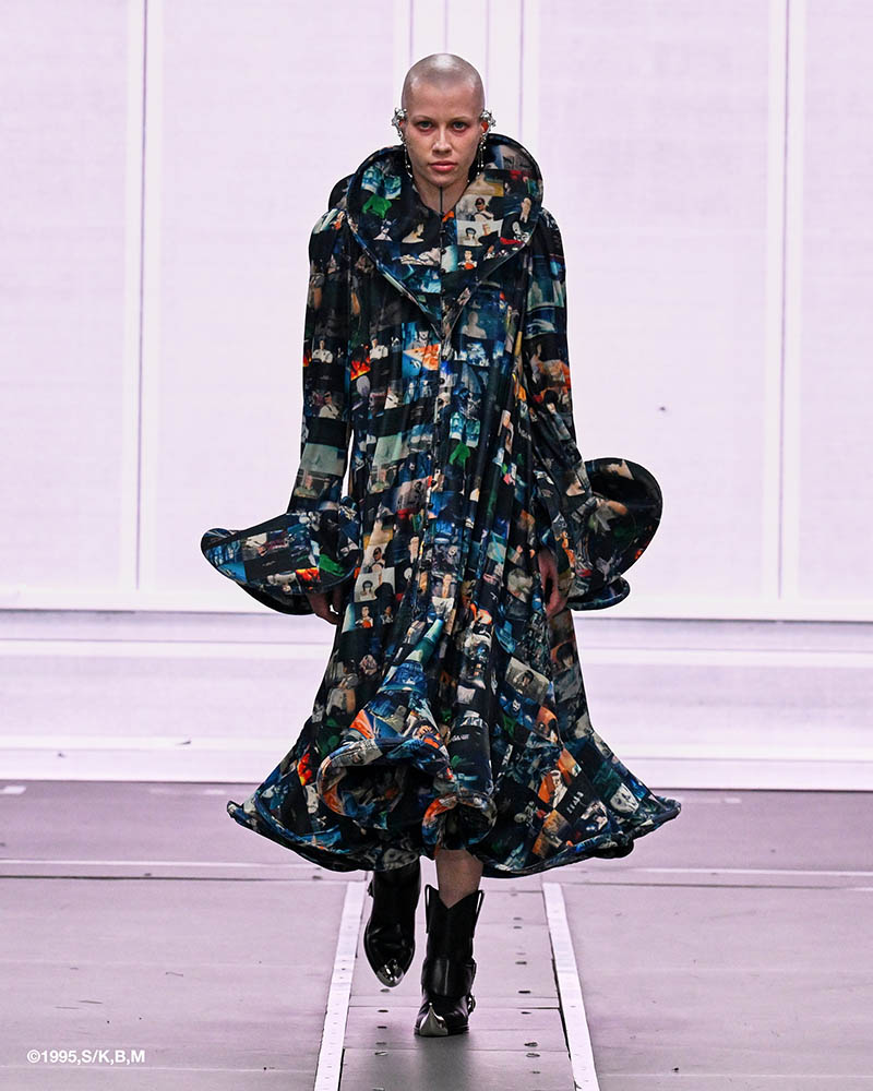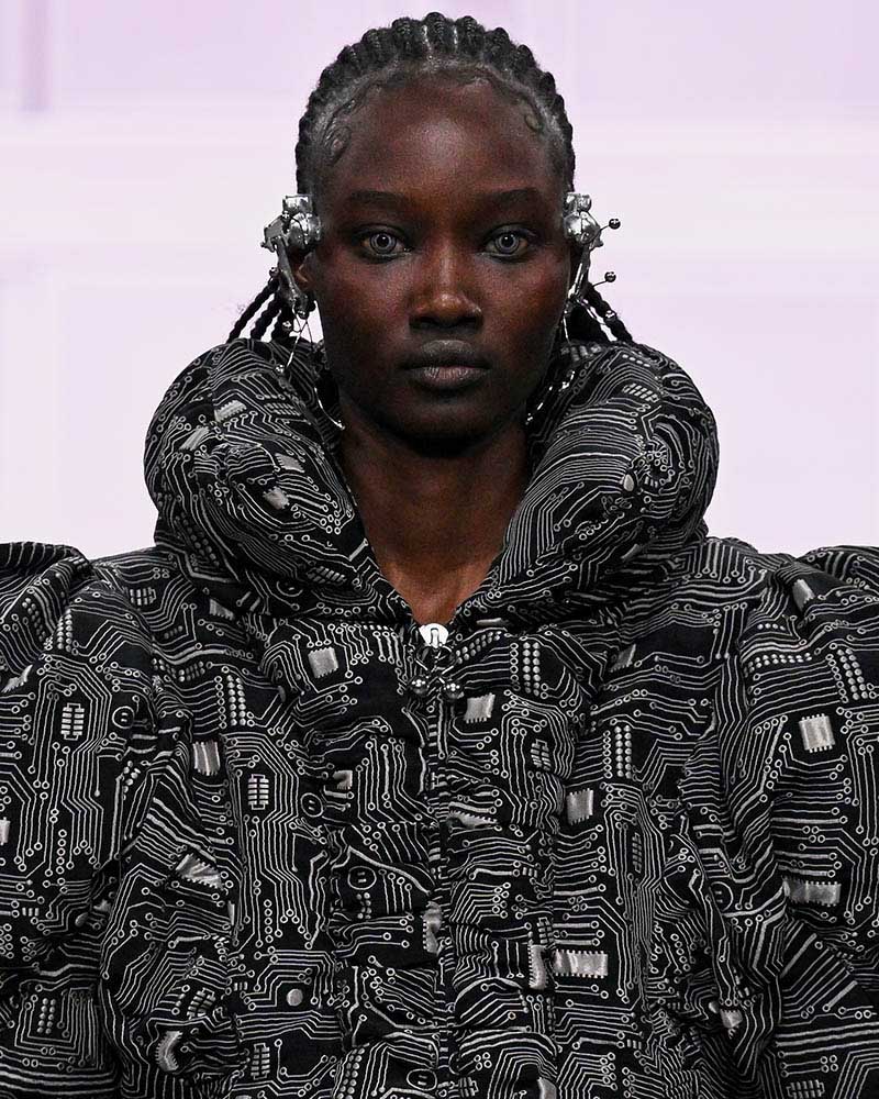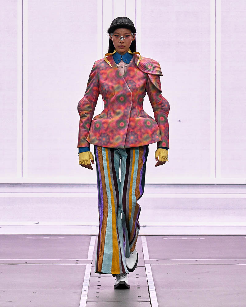 前半は、70年代のヒッピー風やマンガのキャラクターのようなルックが登場。昆虫の甲殻やロボットの装甲を思わせる構造、サイケデリックなプリント、アンテナ風ジュエリーなどが未来的な世界観を印象づけています。