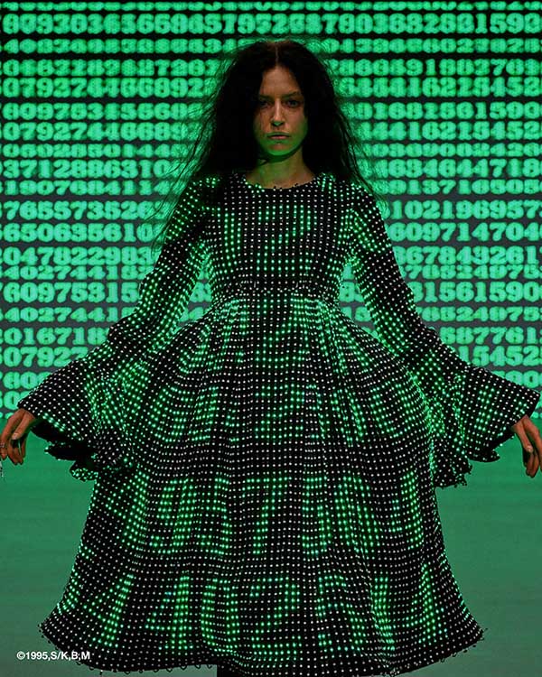 AIによって生成された群衆、数値コード、電子回路のモチーフはジャカードへと変換。水彩画のように淡くにじむ花柄は、京セラのサステナブルなデジタルプリンターによって表現されました。