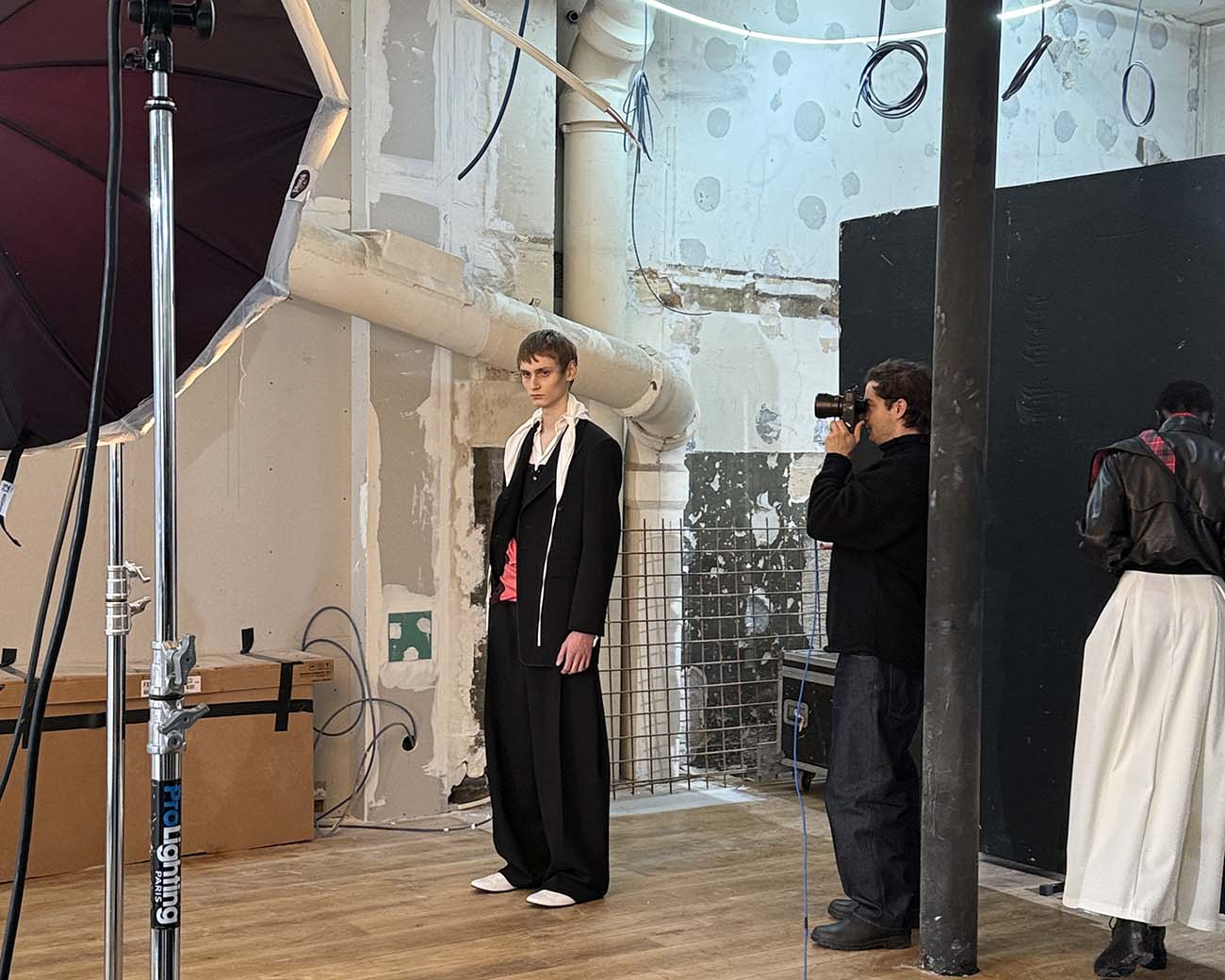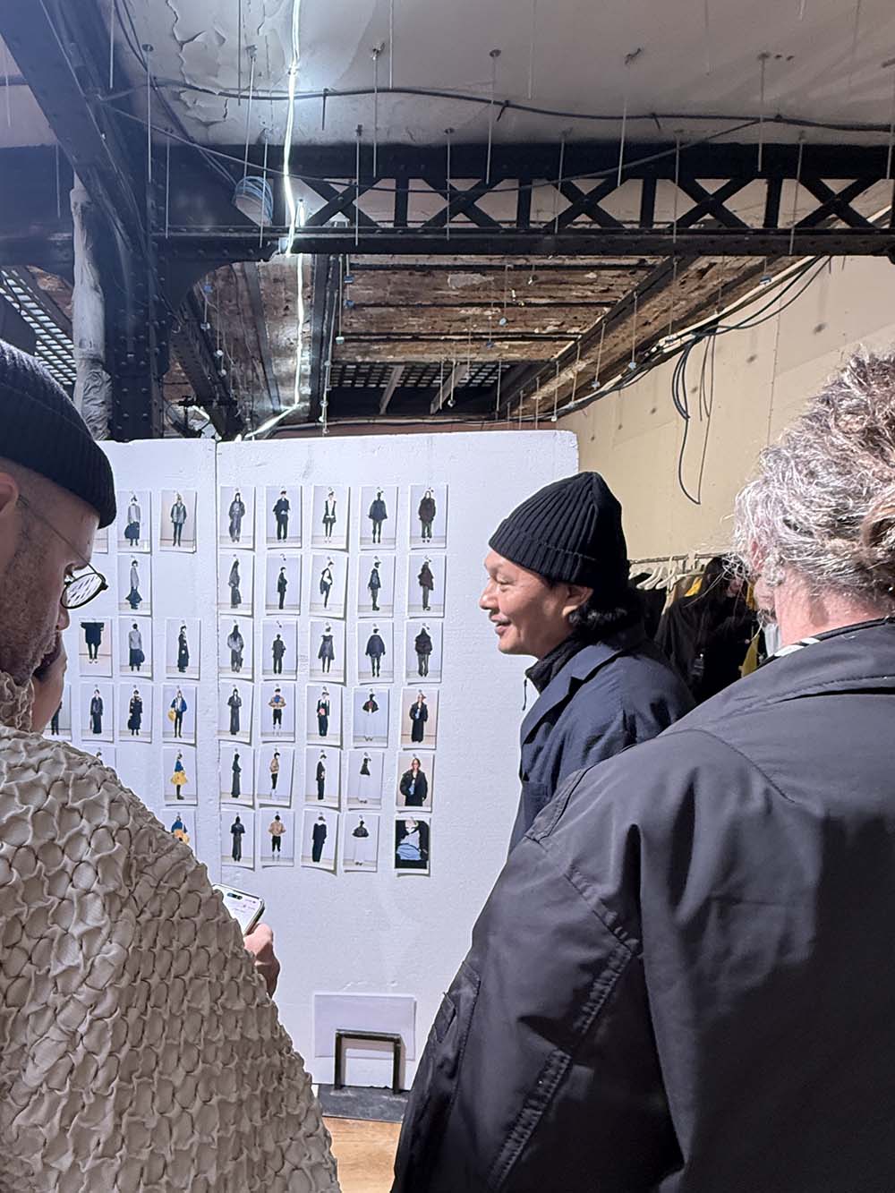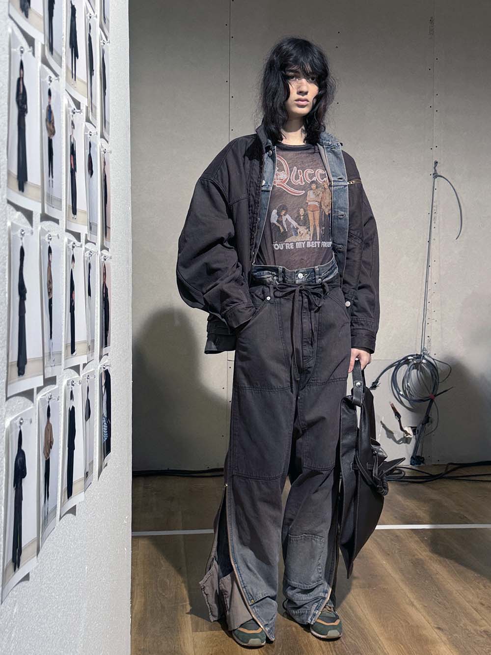 会場では、撮影スタジオを一角に設置し、ショー&プレゼンテーション形式でコレクションを発表。上下逆さまに着用できる、リバージブルで使える、レイヤリングによって構造が変化するなど、ー着の中に“複数のアイデンティティ”を秘めた服が、次々に登場しました。