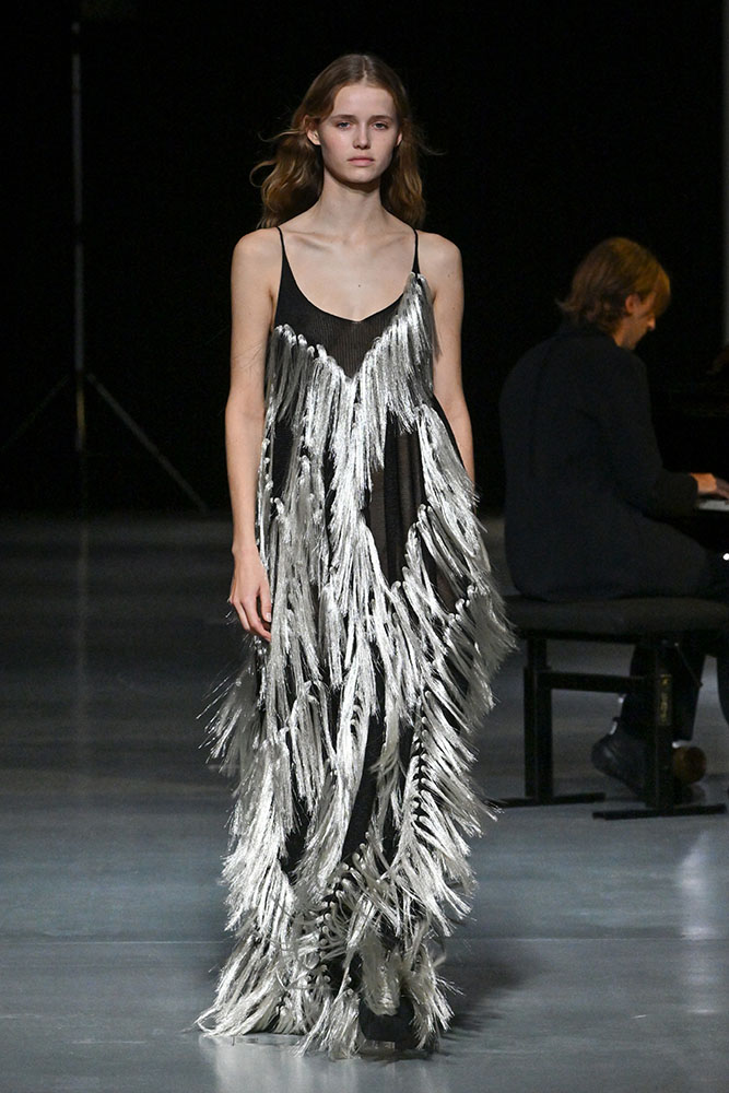 空気をはらんだ丸みのあるシェイプも印象的で、ラストには煌めきのあるタッセル装飾のドレスが登場。彫刻のような造形美と軽やかさが共存する仕上がりになっています。