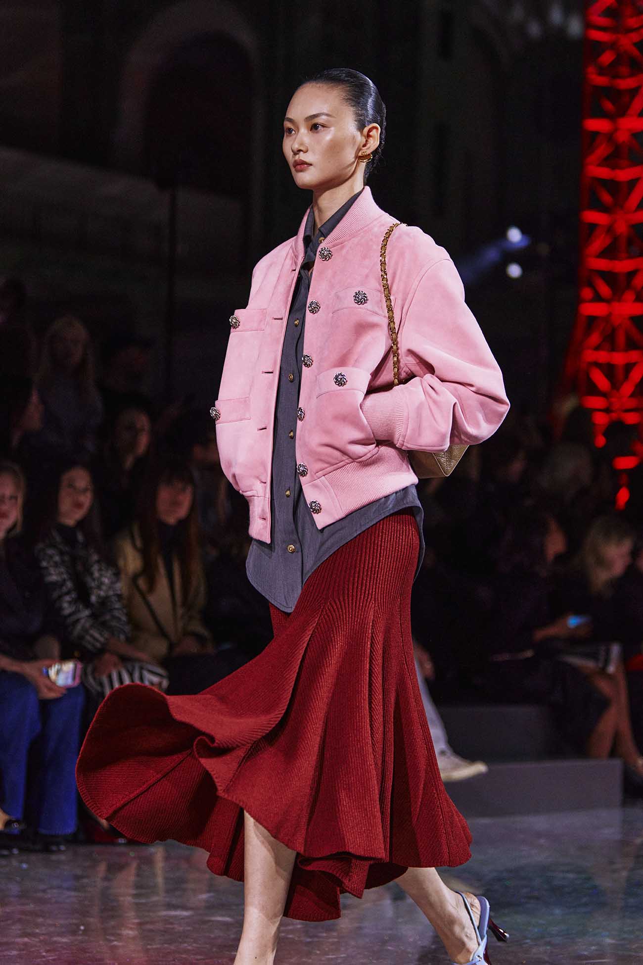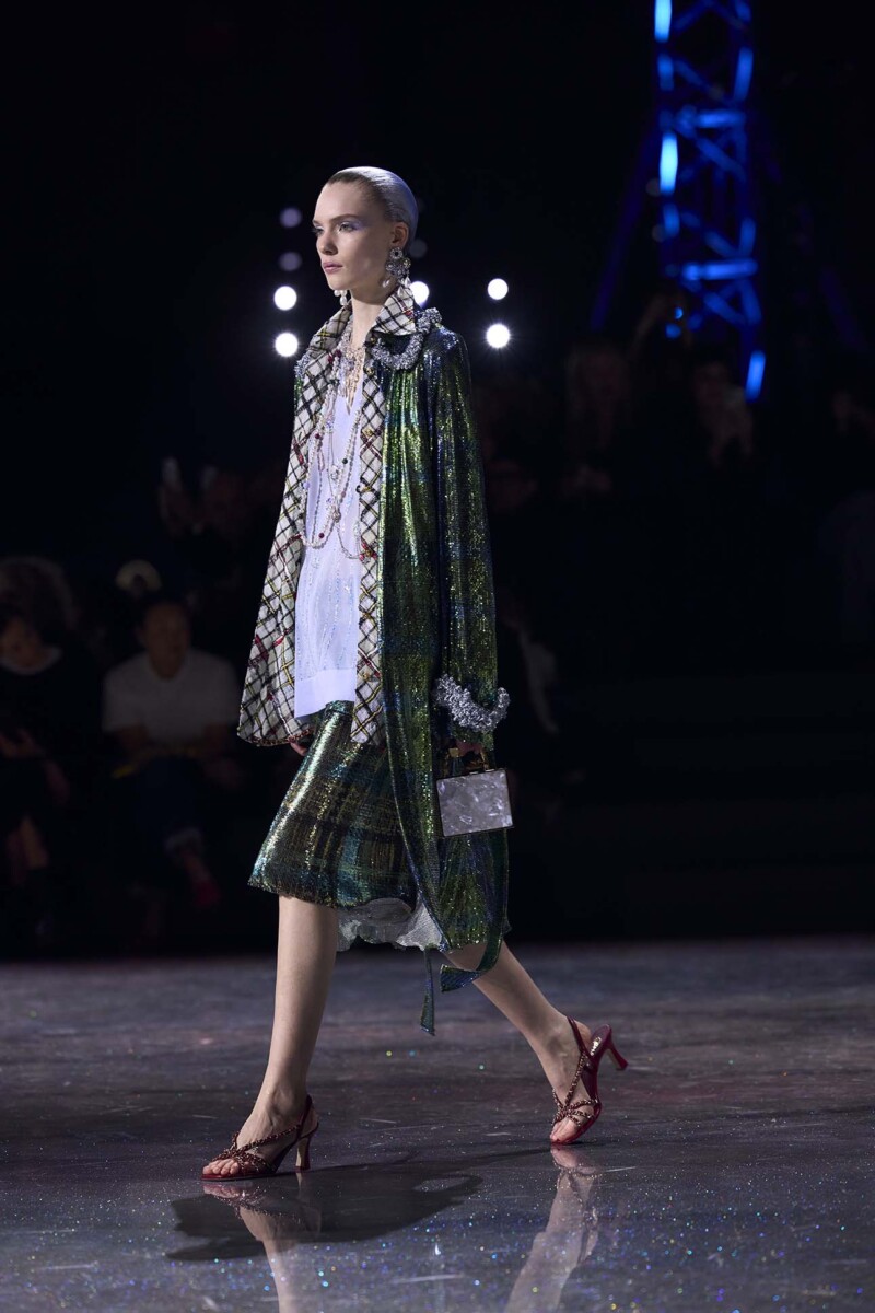 コレクションは1920〜30年代、50〜60年代、そして現代へと連なる時間の流れの中で展開されます。その中心になったのはメゾンを象徴するスーツ。クラシックなツイード、リブニット、ルレックス、シリコンなど、様々な素材で大胆に再解釈されたスーツがランウェイを彩ります。
