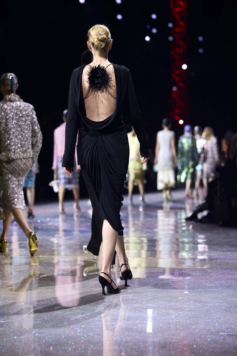 ラストを飾ったミニマルなブラックドレスは、背中にプラスされたコサージュがポイント。シンプルなものから贅沢に装飾されたものまで、自由な空気とエネルギーをまとったコレクションです。