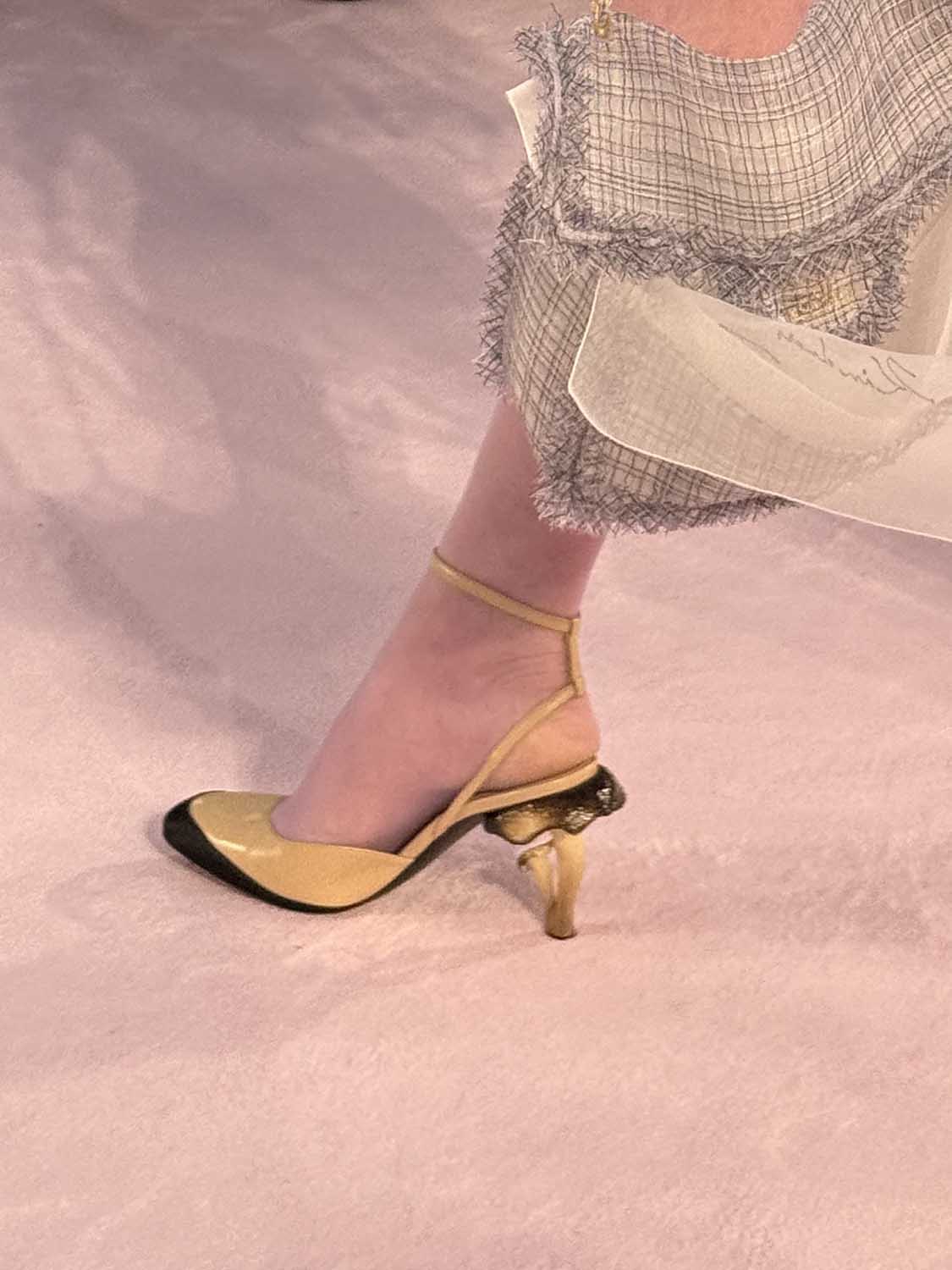 オートクチュールを語る上で欠かせない手仕事は、ヘラサギ、オウム、鳩など、様々な鳥のイメージに重ねられました。繊細な刺繍、プリーツ、織りの技術を駆使した羽根のような装飾は、ため息が出る美しさ。カラフルなキノコのモチーフやキノコ形のヒールも目を引きます。