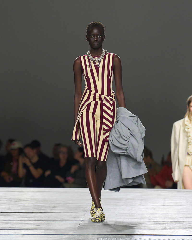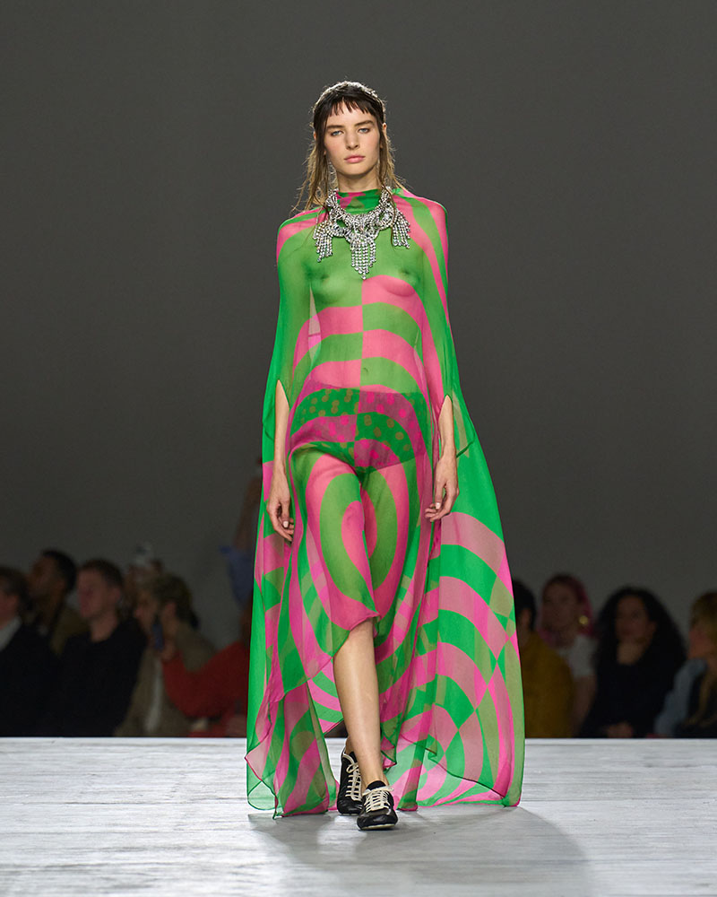 後半に続くのは、1960 年代のオプティミズムを思わせる明るくポップな装い。メリハリのあるジオメトリック模様や軽やかなチュニックドレスがランウェイを彩り、華やかなムードでフィナーレを迎えました。
