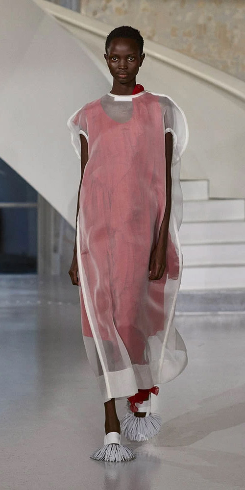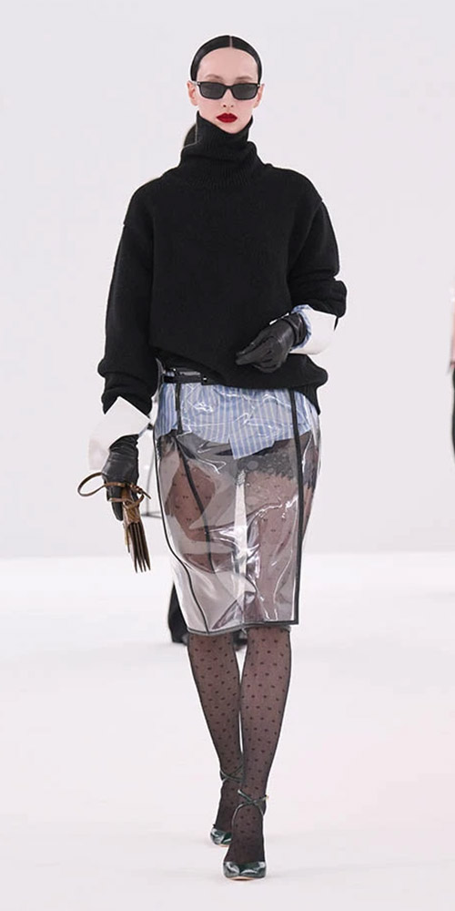次に注目したいのは、シースルーとトランスペアレント。春夏に用いられることが多い素材だが、スタイリングの仕上げに足すことでシルエットを曖昧にし、重くなりがちな秋冬の装いに軽やかさをもたらしている。今シーズンの気分を高めるレイヤードの要素として、活躍しそうだ。
