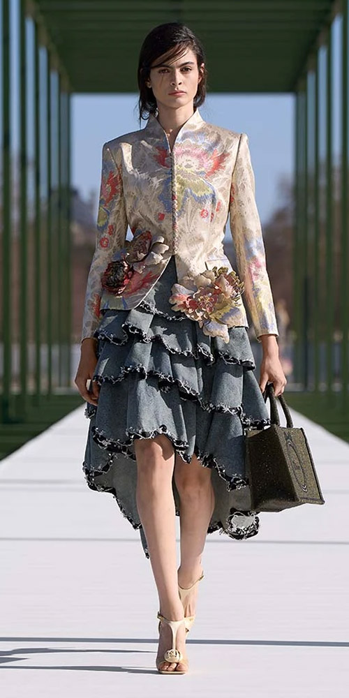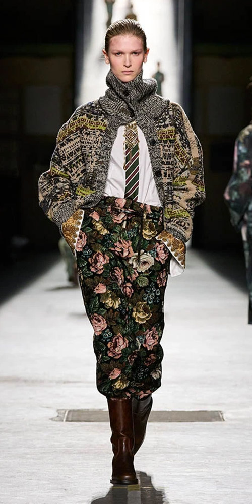 柄に目を向けると、ドラマチックなフラワーモチーフが存在感を見せていた。繊細なプリントにとどまらず、ブロケードやジャカードなど、宮殿の装飾を思わせる重厚なテキスタイルで表現されたものが目立ち、立体的な装飾や大胆なスケールで配された花が、ロマンティックでありながらも力強さを感じさせた。