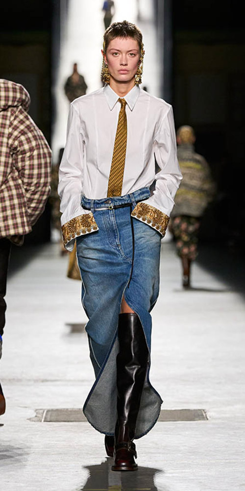 先シーズンに続き、定番のワイシャツも重要な役割を担っている。スクールユニフォームやビジネススーツに欠かせない清潔感のあるアイテムだが、パーツを反転させたり、華やかな刺繍を施したりと、ディテールのデザインや着こなしによって個性を際立たせている。
